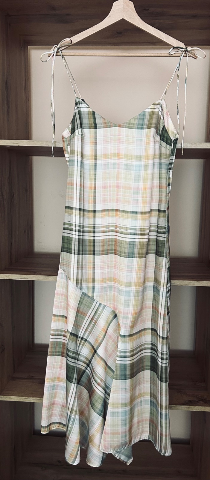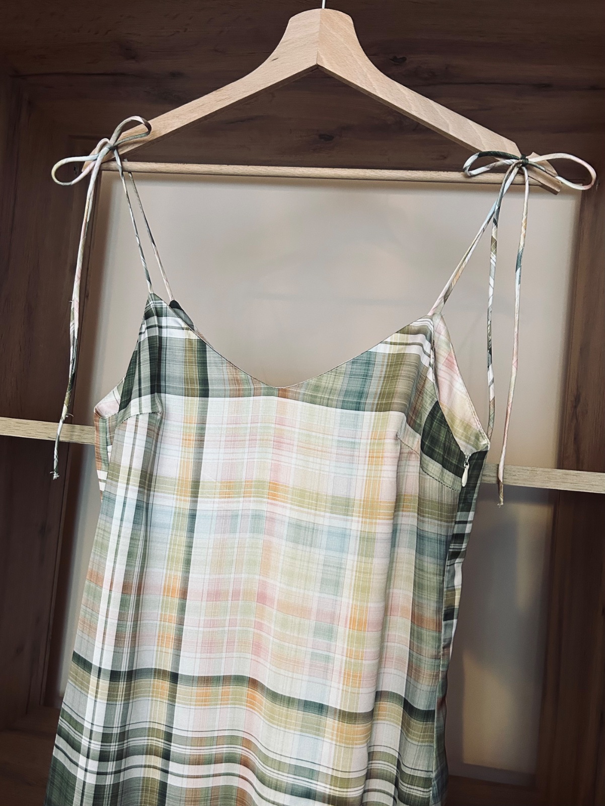 Letné saténové kockované šaty zn. Zara so skrytým bočným zipsom. Špagetkové ramienka. Šaty sú v pastelových farbách: zelena, žltá a ružová.