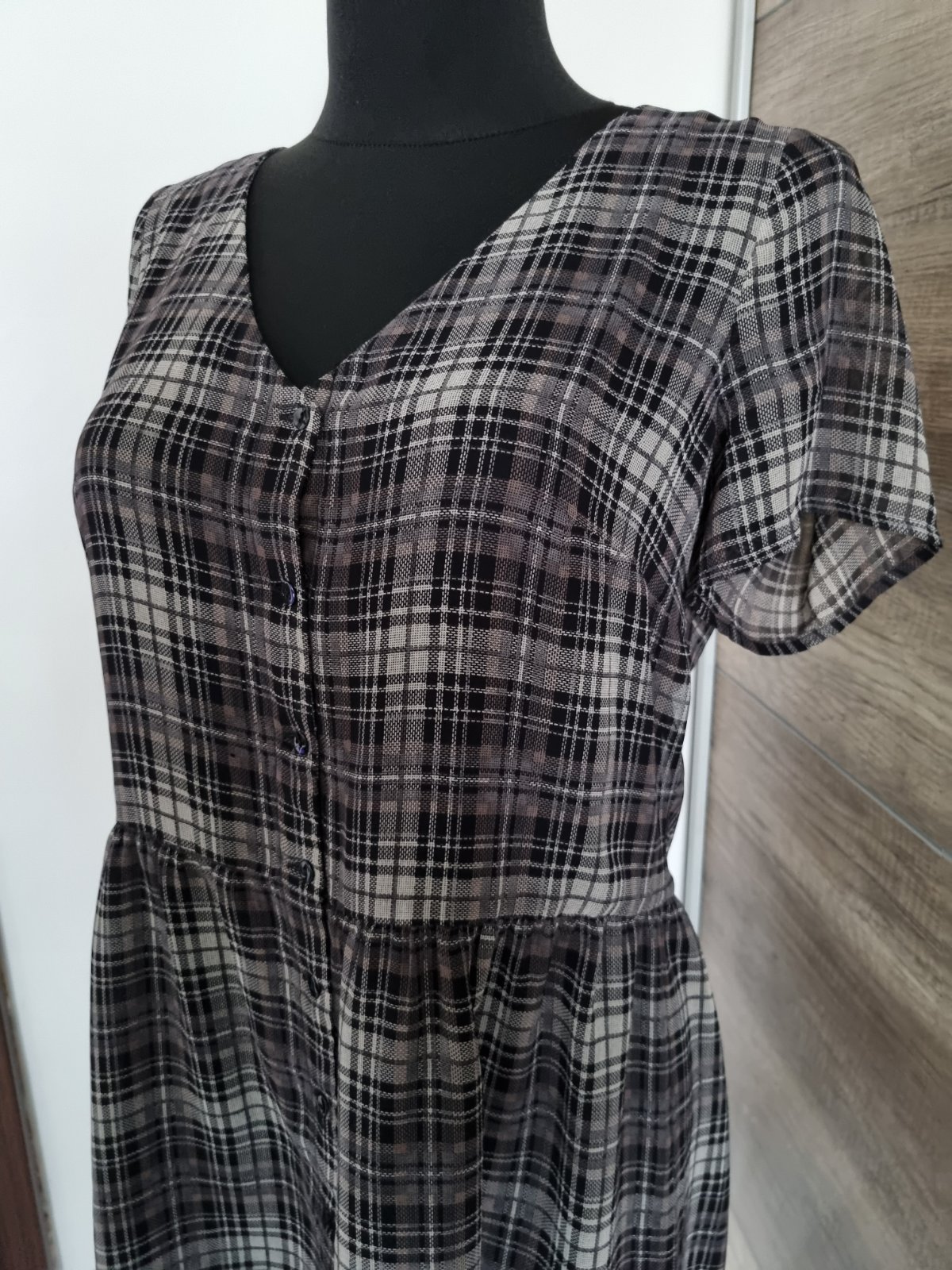 Štýlové a pohodlné košeľové šaty s nadčasovým károvaným vzorom v sivo-čiernej kombinácii. Spodná časť je jemnou čiernou čipkou