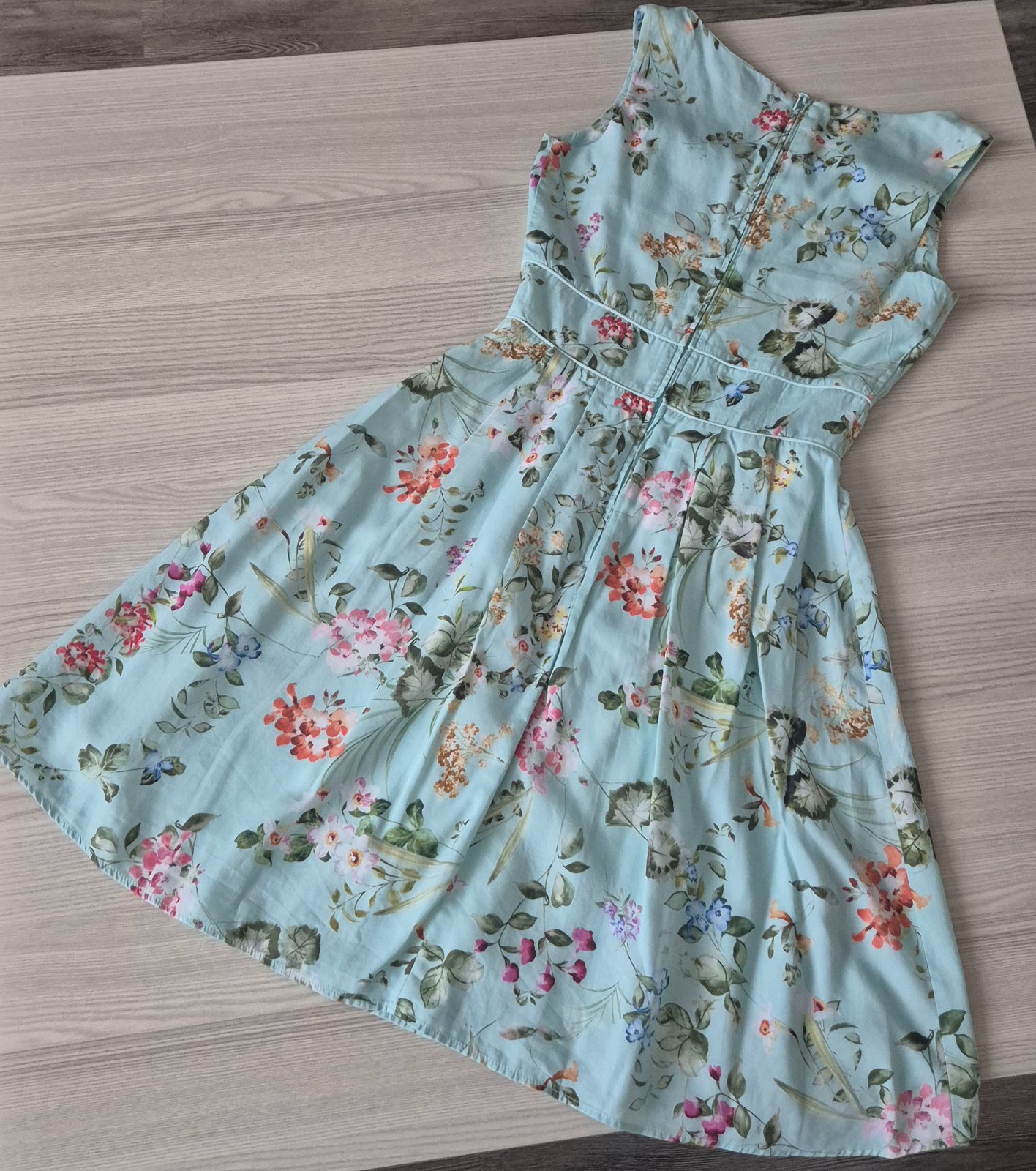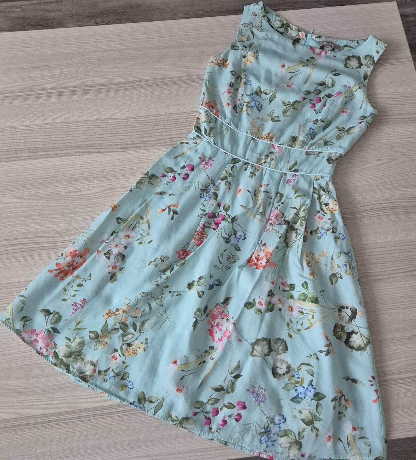Bez poškodenia, výborný stav, bavlnené s podšívkou, zapínanie na zips na chrbáte, dĺžka 90 cm, šírka cez hrudník 2x 39 cm, v páse 2x 32 cm