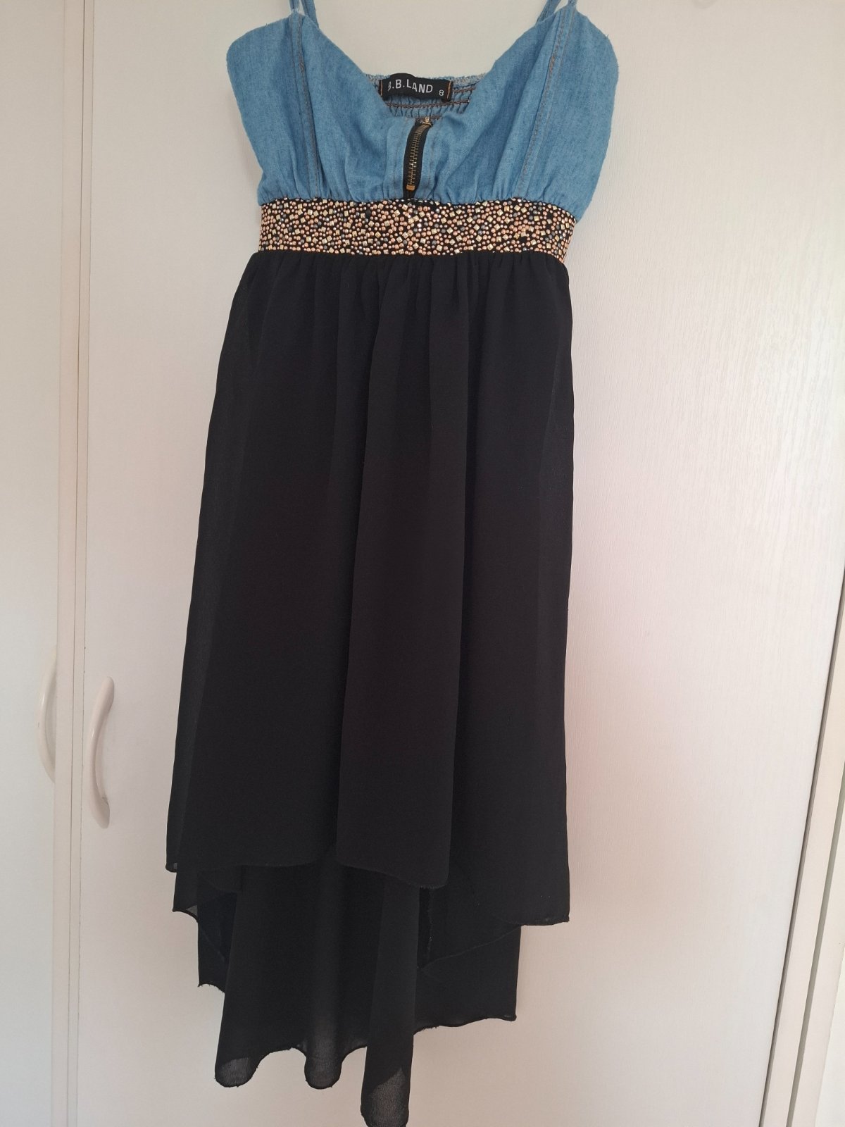 Saticky pre dievcatka, farba Denis suknicka je jemný cierny polyester, sú podsite, na pase je jemno vybijana aplikácia, majú posuvné ramienka, dĺžka od pazuchy je 76 cm vzadu a 54 cm vpredu tu sú kratsie, vrchná časť je vzadu na gumičky na prispôsobenie