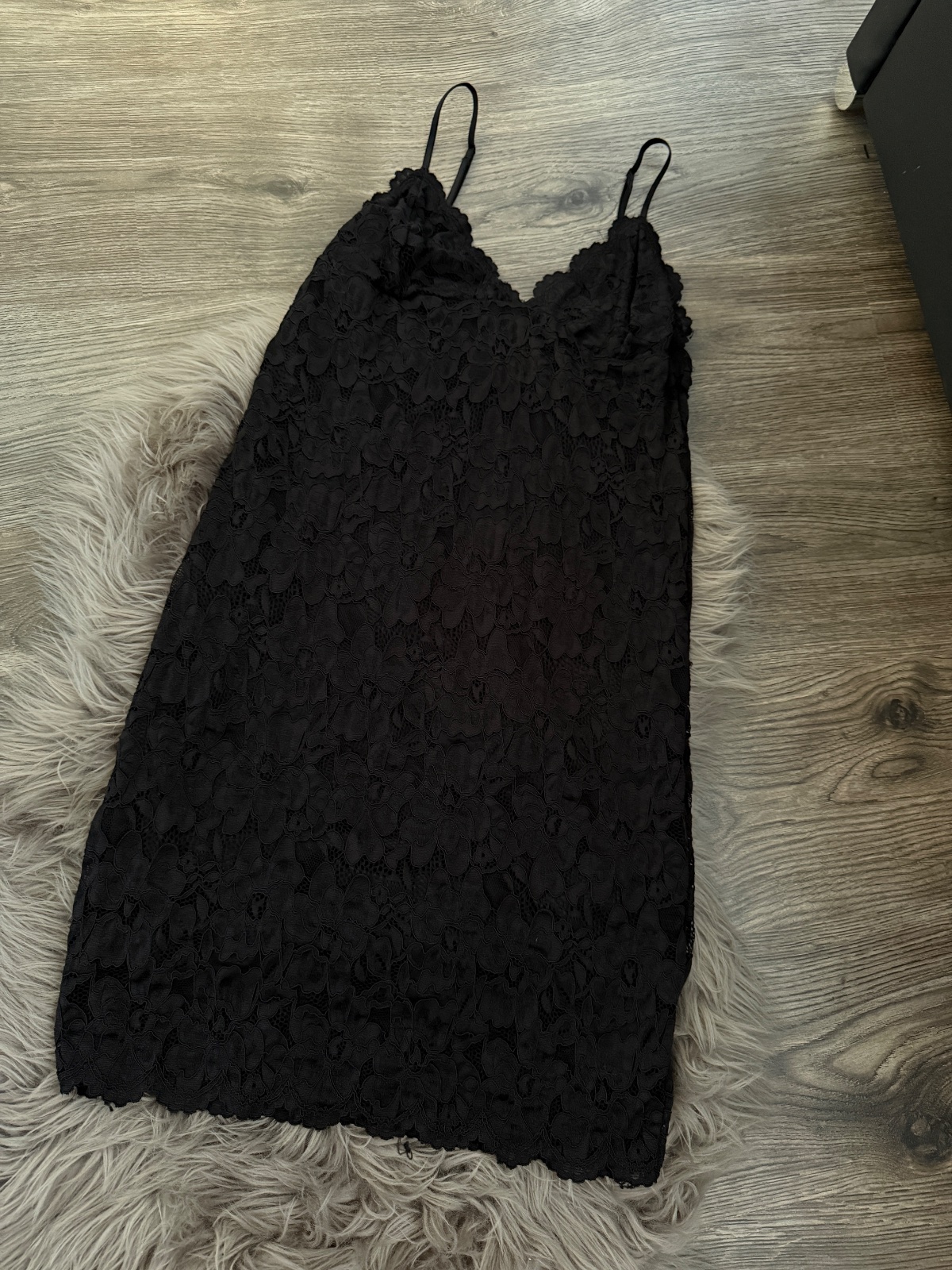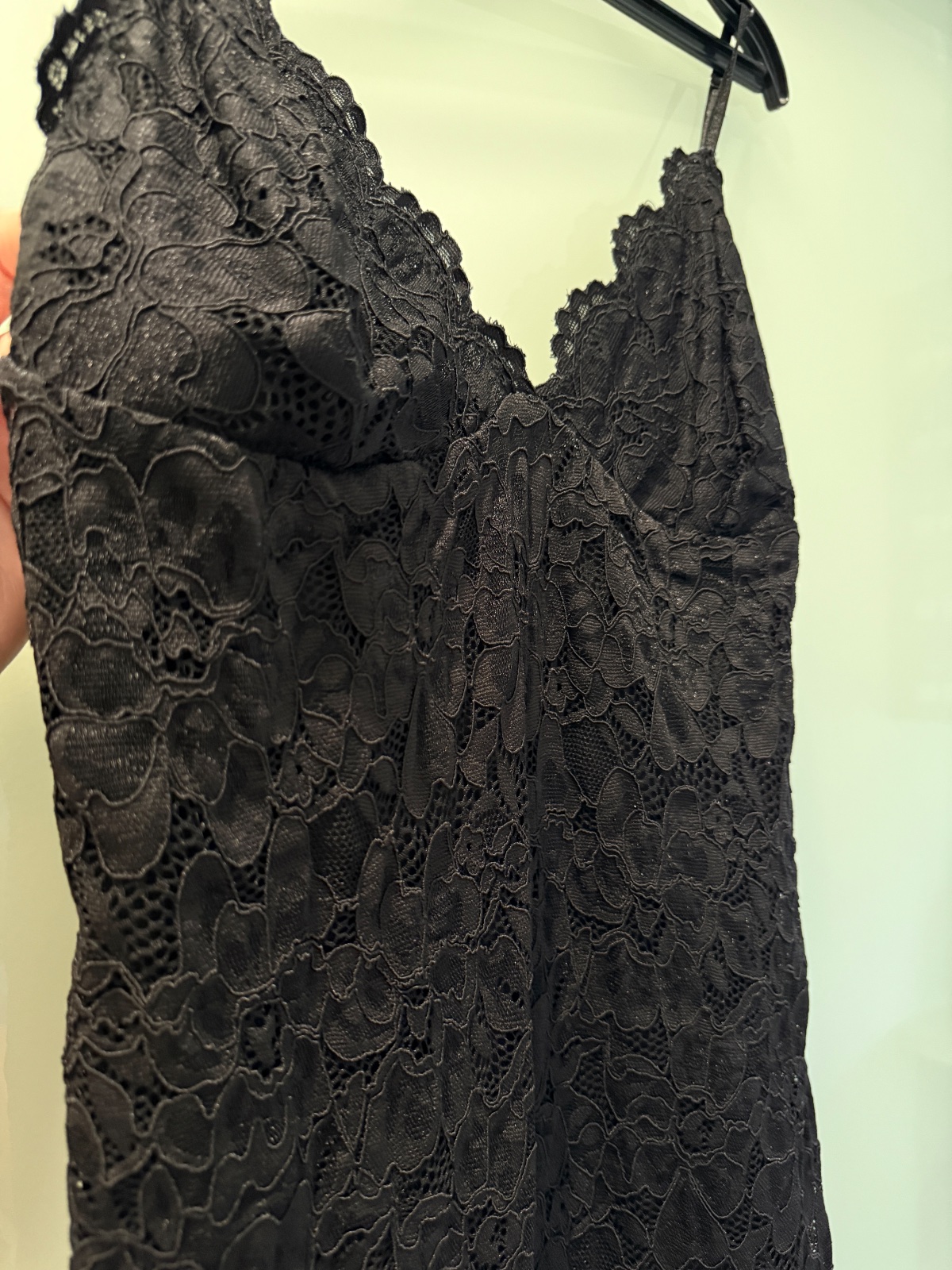 Čierne šaty, nosené, hore čipka/podšitá, nie je priesvitná/, jemne elastická, v páse guma, sukňa plisovaná.