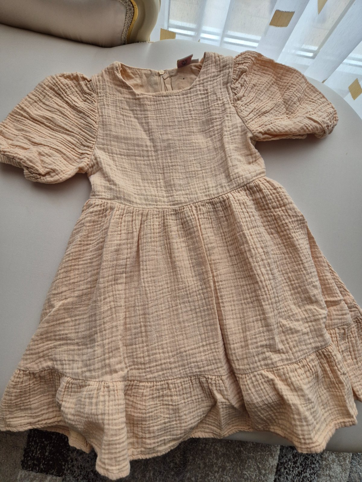Dievčenské šaty vrch z bieleho úpletu vpredu s kvietkami, rukávky a suknička je z béžovej kockovej látky, po oboch bokoch šnúrky, ktoré sa dajú zaviazať.Dĺžka 66cm, pod pazuškami 2x30cm