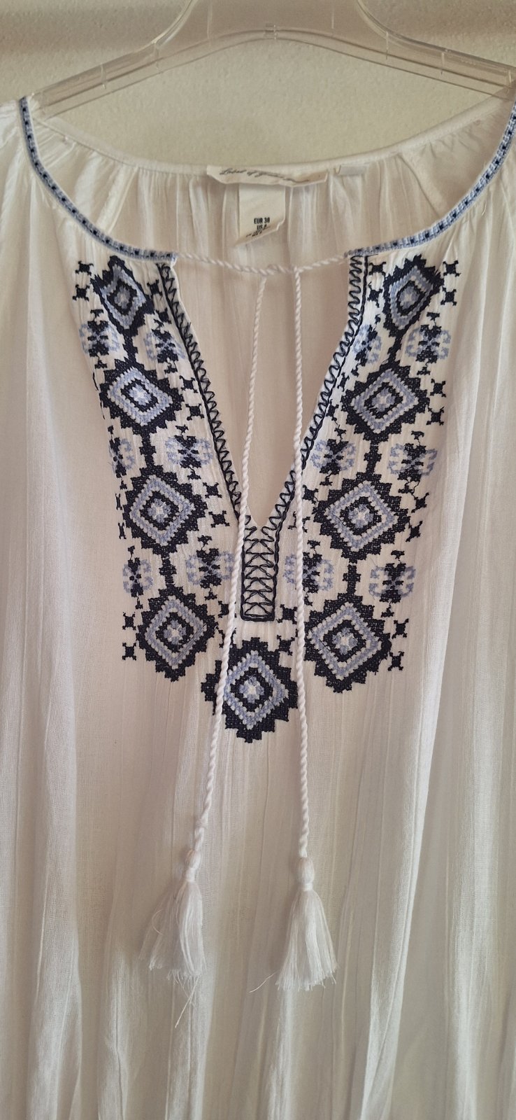 Krásne jemné šaty, malo nosené s krásnou výšivkou. Vzadu je malinký fliačik. 100% bavlna. Výborný stav.