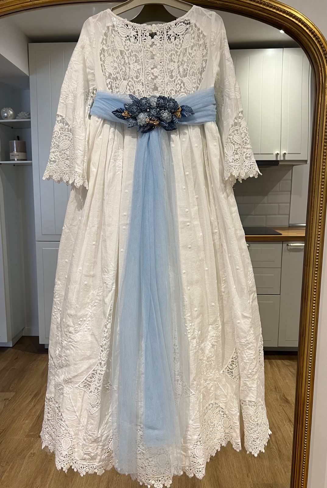 Krasne saty na prve sväte prijimanie, kupovane v Spanielsku , stali 750€ saty opasok 150€ a korunka 150€ Su vhodne taktiez na svadbu, oslavu, narodeniny alebo Vianocnu veceru ... krasne bohate a zdobene spanielskou cipkou. Boli oblecene len v kostole a na fotenie.