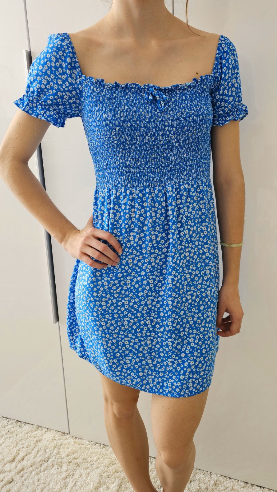 Výborný stav, takmer nové, nesadla veľkosť. Materiál viskoza. Cez poprsia až po pás je elastické nariasenie gumičkami. Kupované v New Yorker.