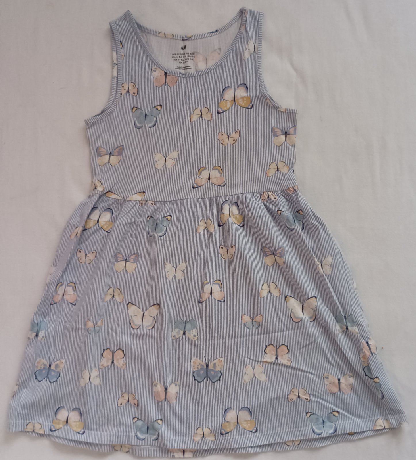 Veľmi dobrý stav! Dievčenské šaty bez rukávov, pásikavé, s motýľmi, elastické, materiál 100%bavlna. Pre 7-8r. ROZMERY: dĺžka: 61cm, od pazuchy dĺžka dole: 47,5cm, pod pazuchami meraná šírka: 2x29,...