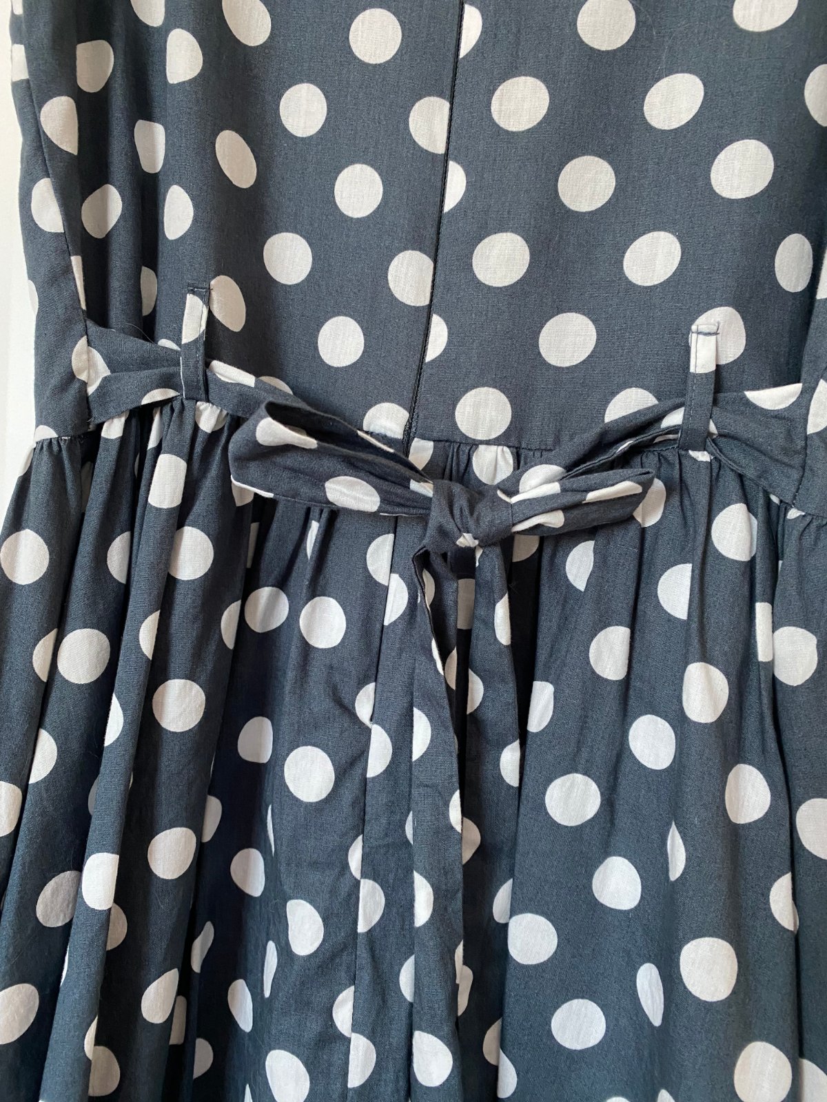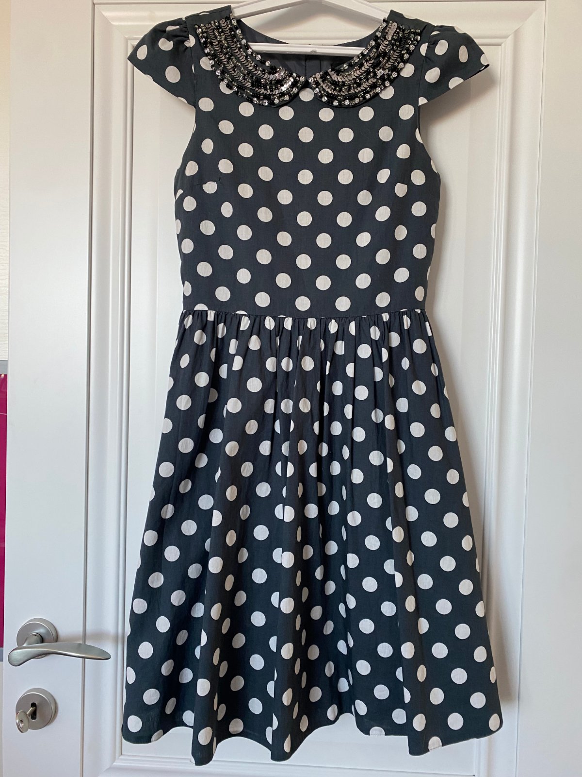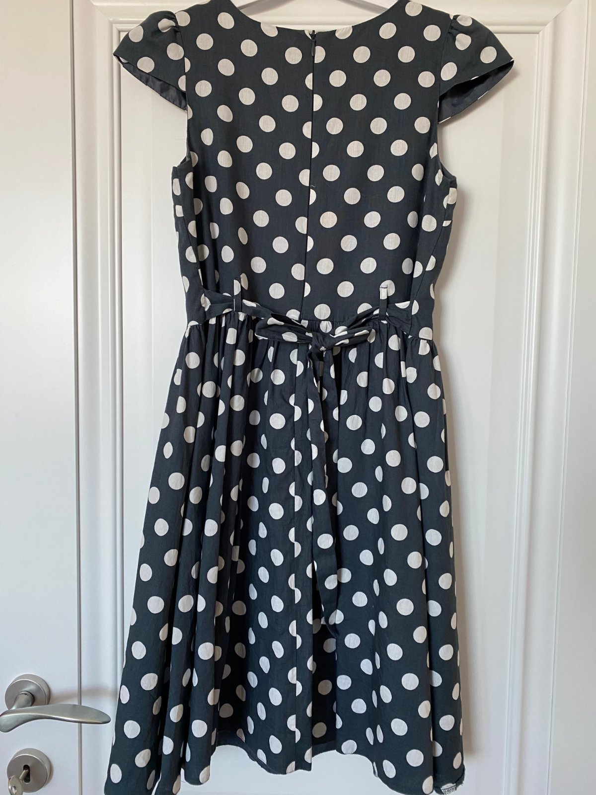 Letné šedé šatky s bielymi bodkami, malé pufkové rukávky, ozdobný kamienkový límec, vzadu na zips a mašľa na uviazanie. Od pása trochu nariasené. Dĺžka je 87cm, šírka je 37cm. V úplnom poriadku