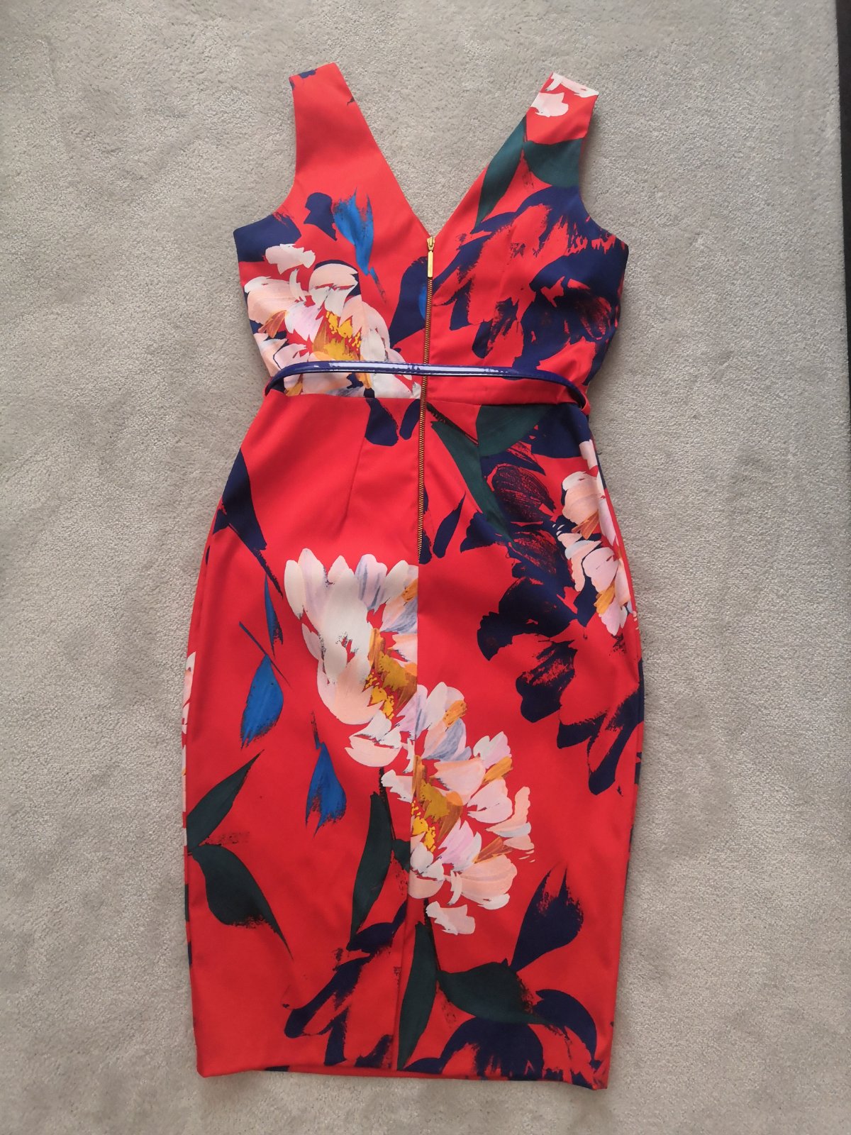 Krásne farebné šaty zvýrazňujúce postavu, použité len raz, vzadu zips, opasok. Materiál nie je priesvitný a jemne elastický. Rozmery: dĺžka 108cm, pás 38cm a šírka cez prsia 44cm. Opasok dlhý 85cm, prvá dierka 65cm a posledná 75cm.