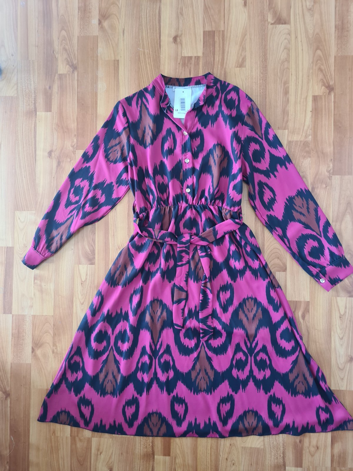 Perfektné ľahučké šaty na gombíky, z polyesteru, viskózy a elastanu. Majú aj vrecká! Dĺžka - 120 cm, šírka - 2x 62 cm, boky - 2x 65 cm.