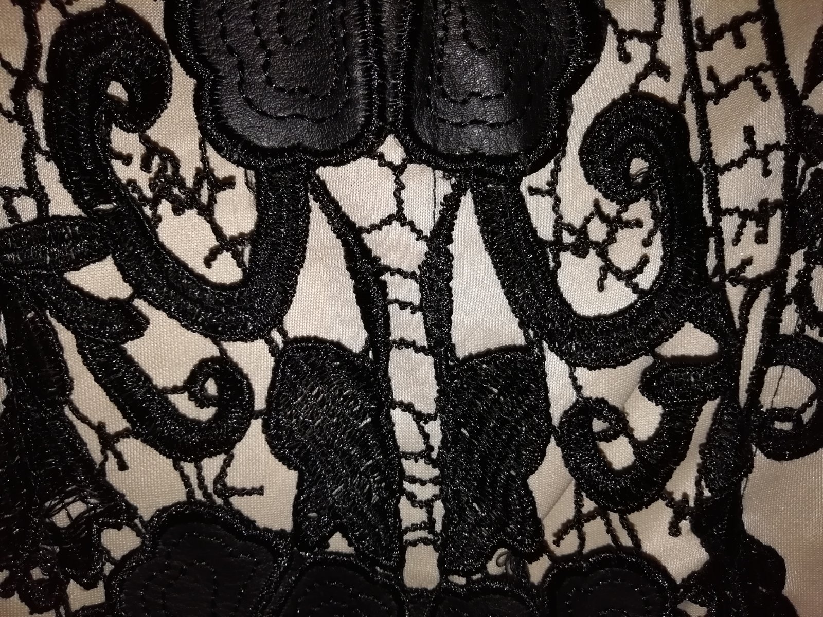 Dámske šaty zdobené čipkou. Farba: svetlohnedá a čierna. Elastický materiál, tenší príjemný materiál sa perfektne prispôsobí postave, ale nepresvitajú (nie je to taký klasický tvrdý materiál, z ktorého je väčšina puzdrových šiat). Na čipke sú sem tam popretrhané nitky (viď foto) - zohľadnené v cene. Inak bez poškodení. Celková dĺžka od ramena dole 90 cm, šírka pod rukávmi v kľude 2 x 41-43 cm.