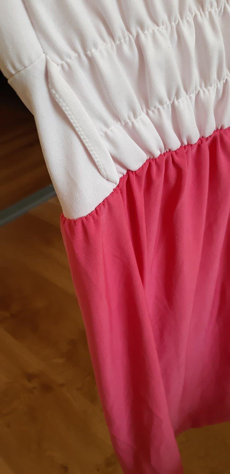 Letné šatičky volného strihu do A, vzadu na zips, vzdušný materiál, veľkosť xs, oblečené 2krát, ako nové, bez vád a chýb. Rozmery : dĺžka od krku 81cm, prsia 2x40cm, pás 2x44cm. + postovné