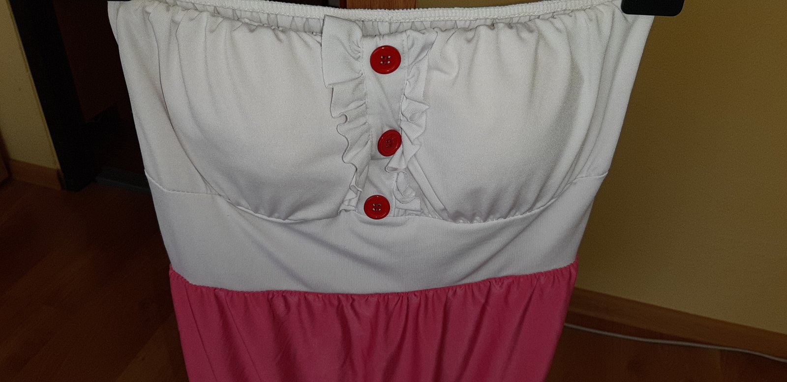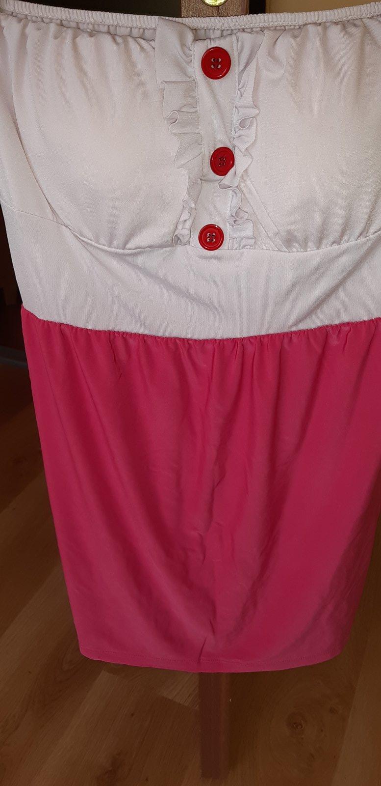 Saténové minišaty, bez ramienok so stuhami. Podšité. Horná širka 37 cm, vzadu je gumička-povolia. Dĺžka 68 cm.