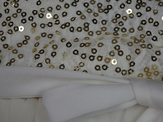 Kvalitné biele šaty zdobené zlatými flitrami, materiál 100% nylon, podšívka 100% polyester, super stav.