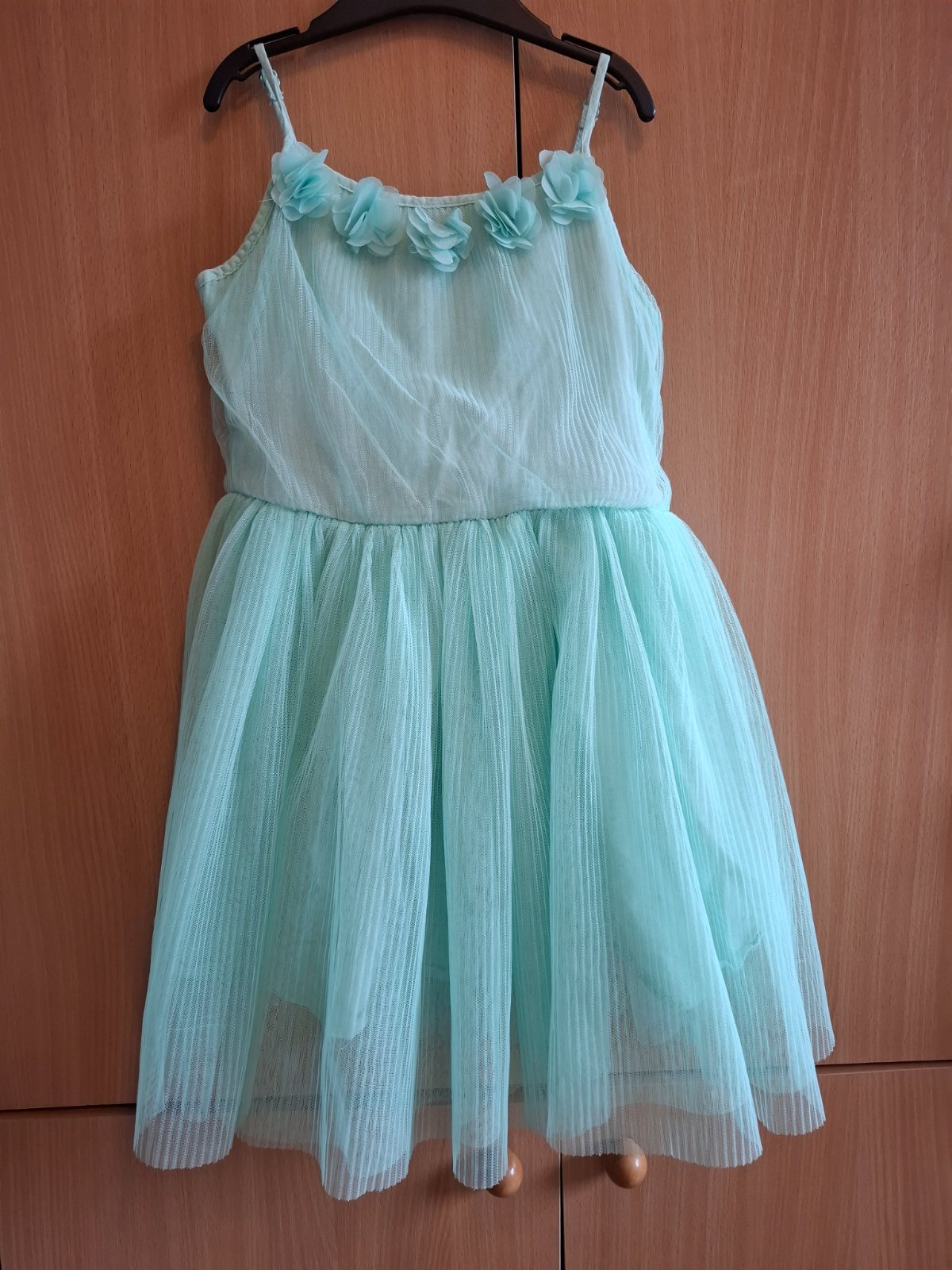 Krásne šaty mentolové s krásnymi kvetmi.Vzor vid.foto. Bez poškodenia, ako nové. Velkosť je 110. Cena je bez poštovného. Ďakujem za nahliadnutie.