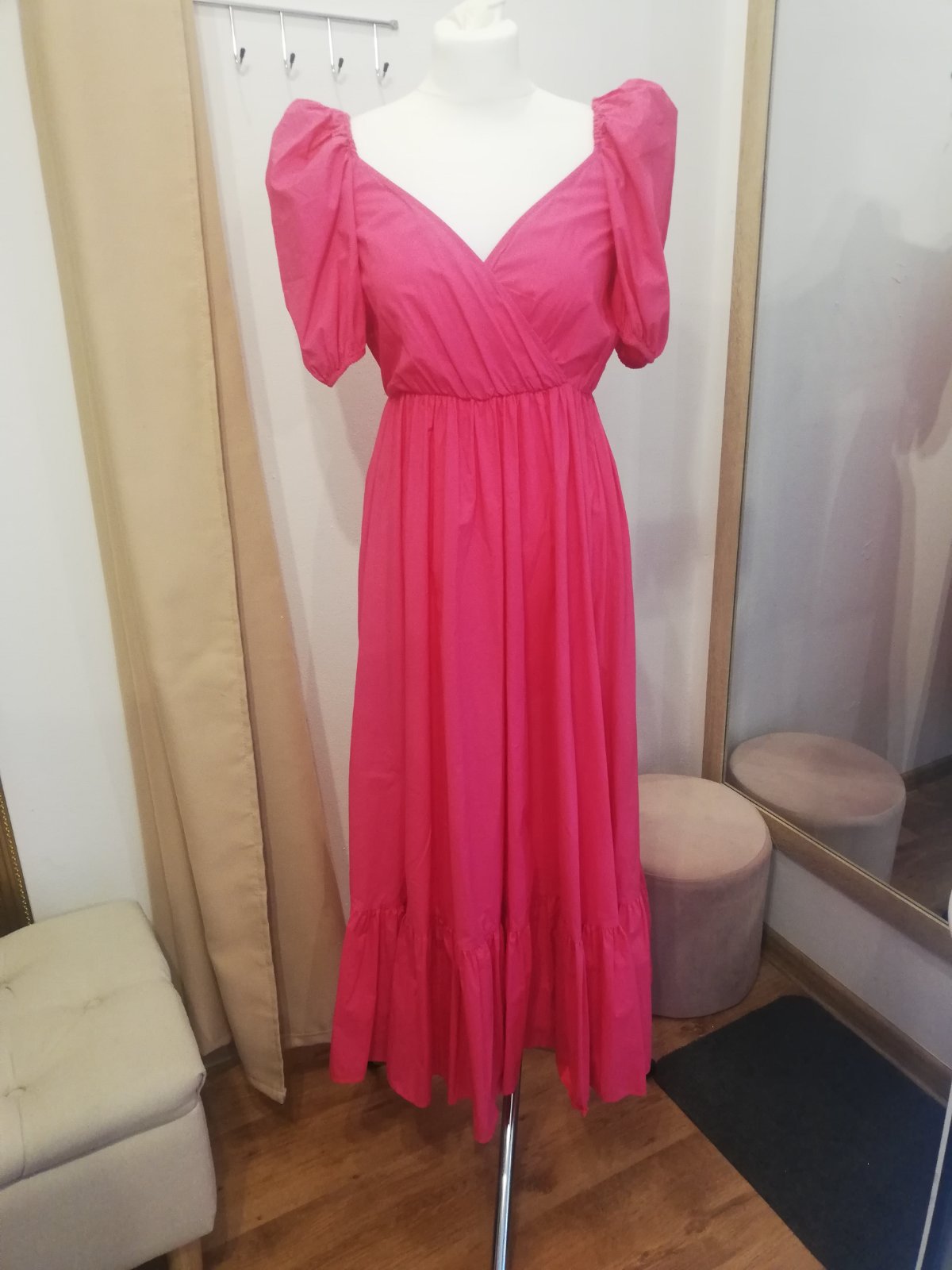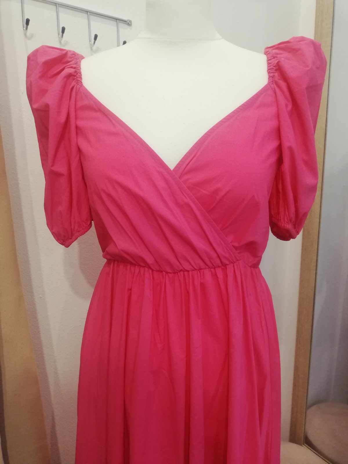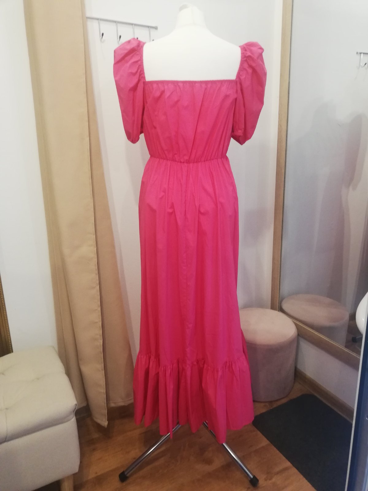 Krásne ZARA šaty, v páse na gumičku. Rukáv tiež na gumičku aj hore je gumička takže rukáv nepadá. Super sa prispôsobia, sedia na veľkosť S, M, L. Sukňa padava, nenaberá objem, čiže šaty nerozširujú postavu, práve naopak všetko zamaskuju. Su ľahké, krásna ružová farba.