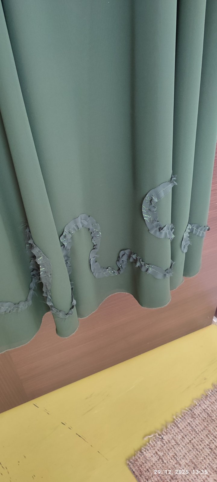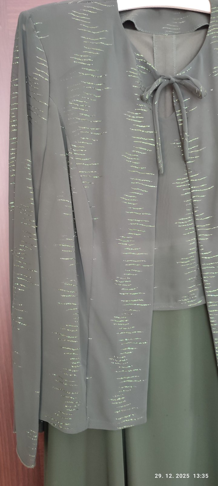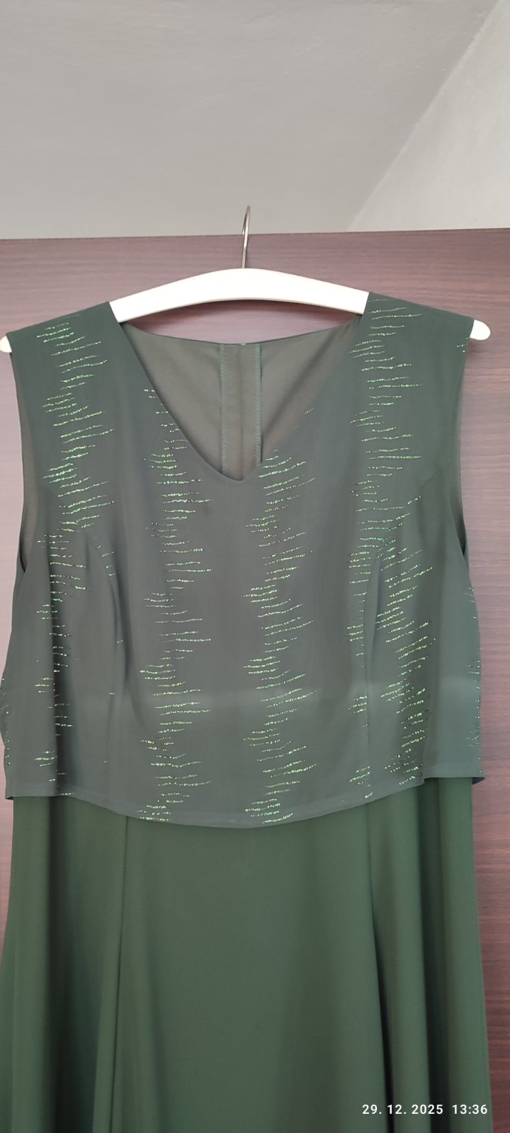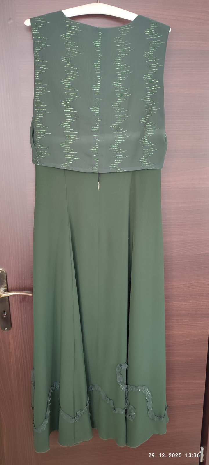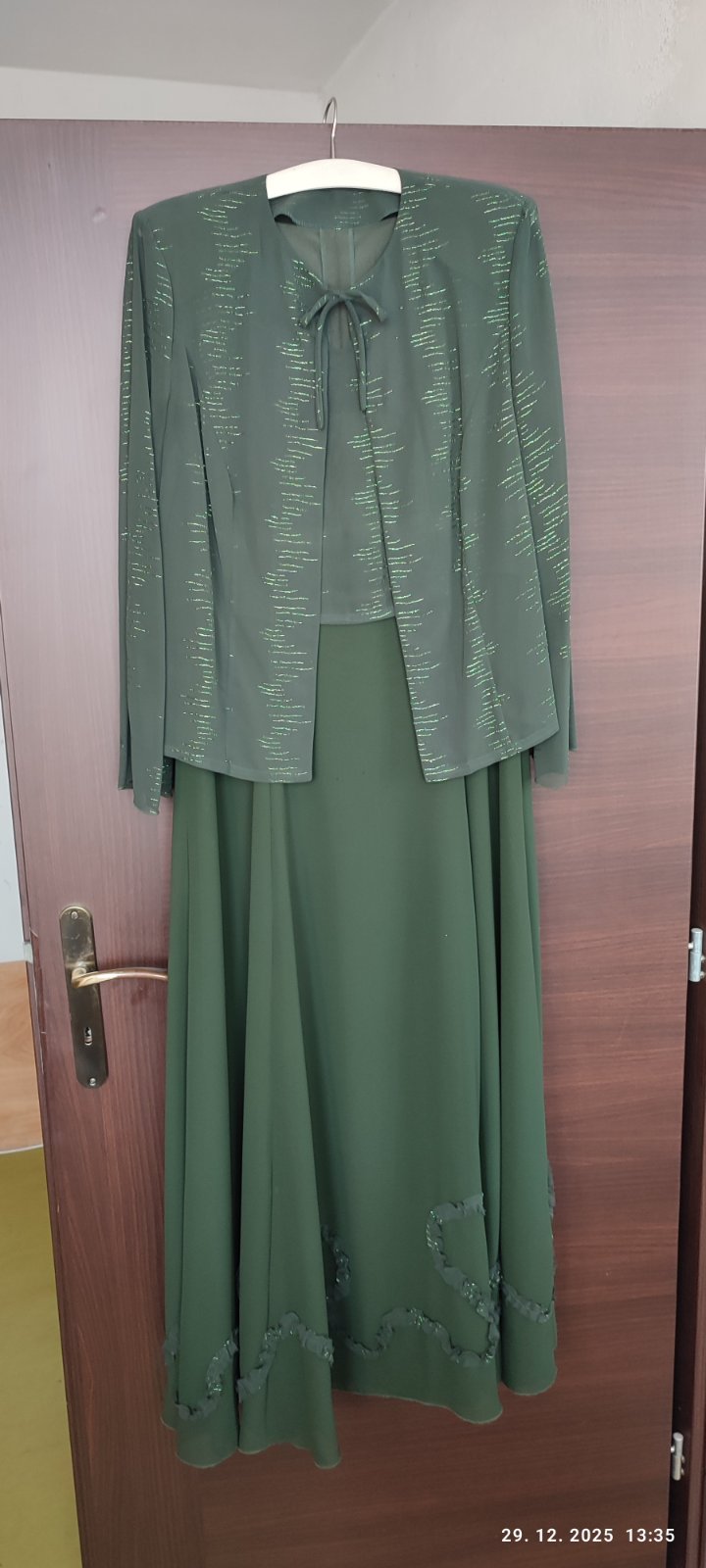 Spoločenské šaty pre nižšiu postavu, tmavozelena farba, bez rukávov a s transparentným bolerkom. Ručne šité aj s aplikáciami. Dĺžka 145cm, prsia 2x47, pás 2x43, rukáv bolerka 60cm. Šaty oblečené 1x. Majú drobné zašpinenie, pár bodiek (viď foto), treba dať vyčistiť.