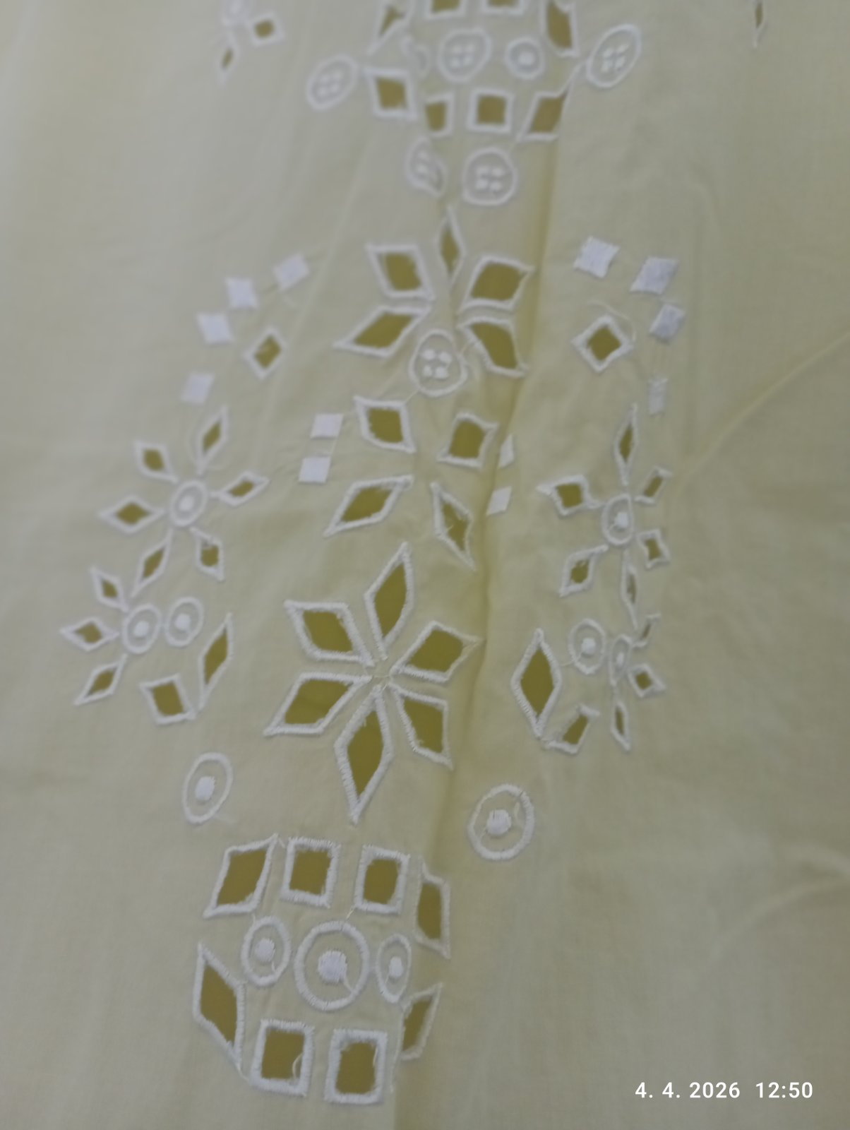 Tenučké, ale dvojvrstvové, s krásnymi madeirovými výšivkami. Vhodné na horúce letné dni a podľa mňa aj na príležitosť. Skôr pre nižšiu dámu. Uvedená je veľkosť 44, ale podľa mňa sedia na M. Pozrite radšej na rozmery na fotkách (hlavne boky).