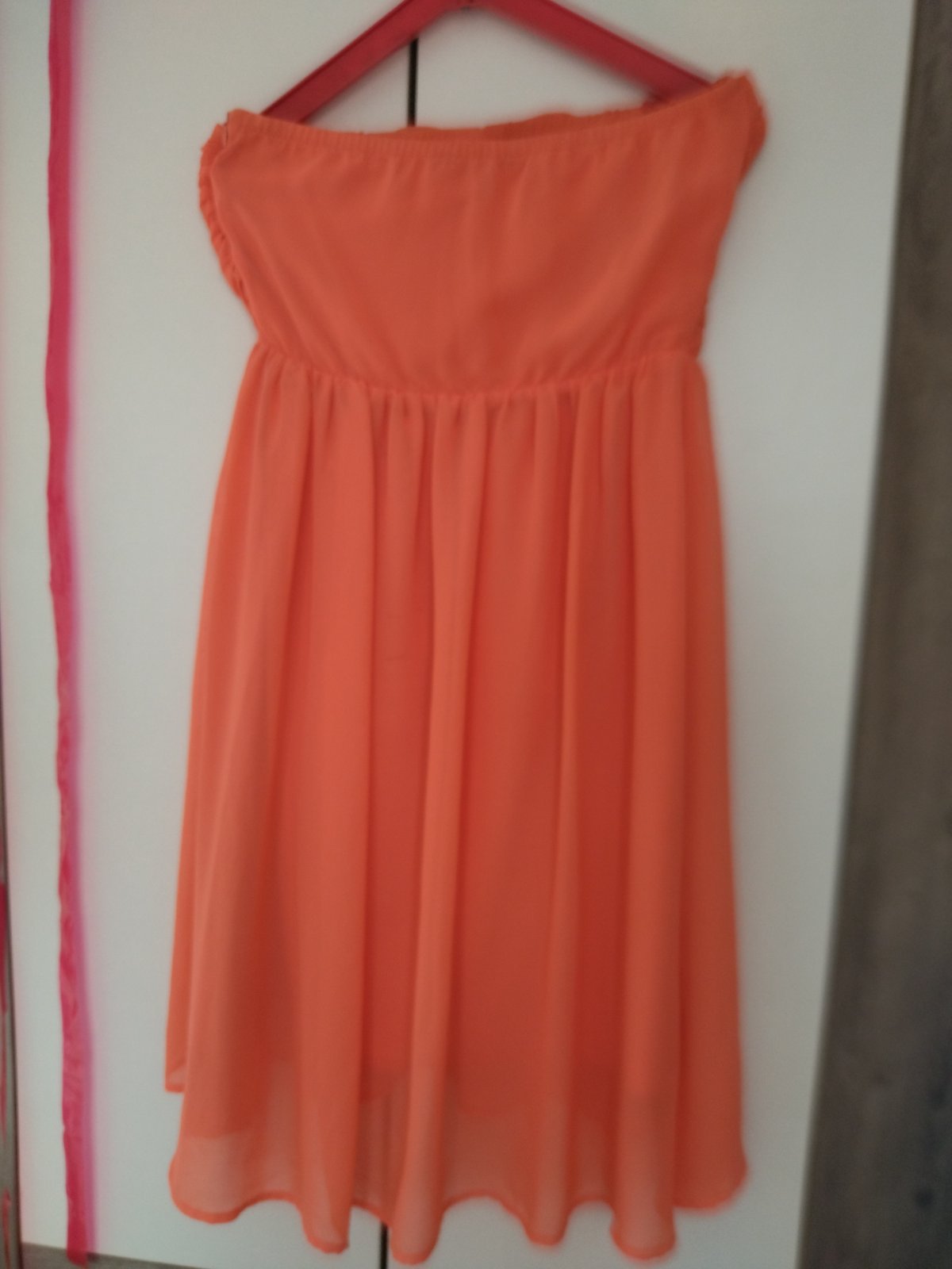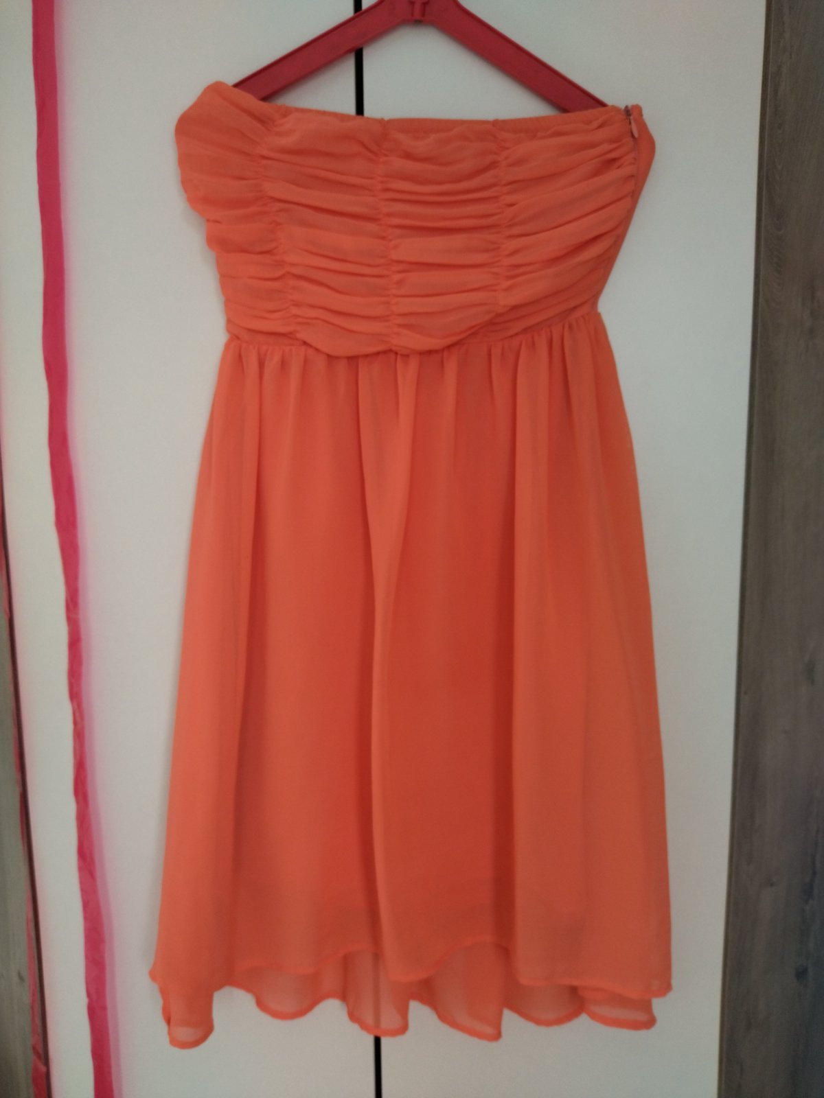 šaty s riasením vhodné aj na bežné nosenie aj na príležitosť, pekná syta farba meruňková trochu do lososovej, nad kolená. v prípade potreby premeriam, pri odbere viac vecí pošta zdarma, ďakujem