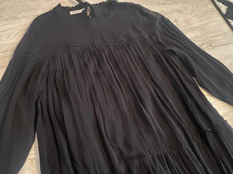 Boli len raz oblečené na svadbu. Vzor: kvetovaný Strih: áčkový Dĺžka: po kolená (vzadu sú dlhšie, viď. foto) Výstrih: véčkový Rukáv: dlhý Typ materiálu: viskóza Materiál: 100 % viskóza Pozn.: Dán...