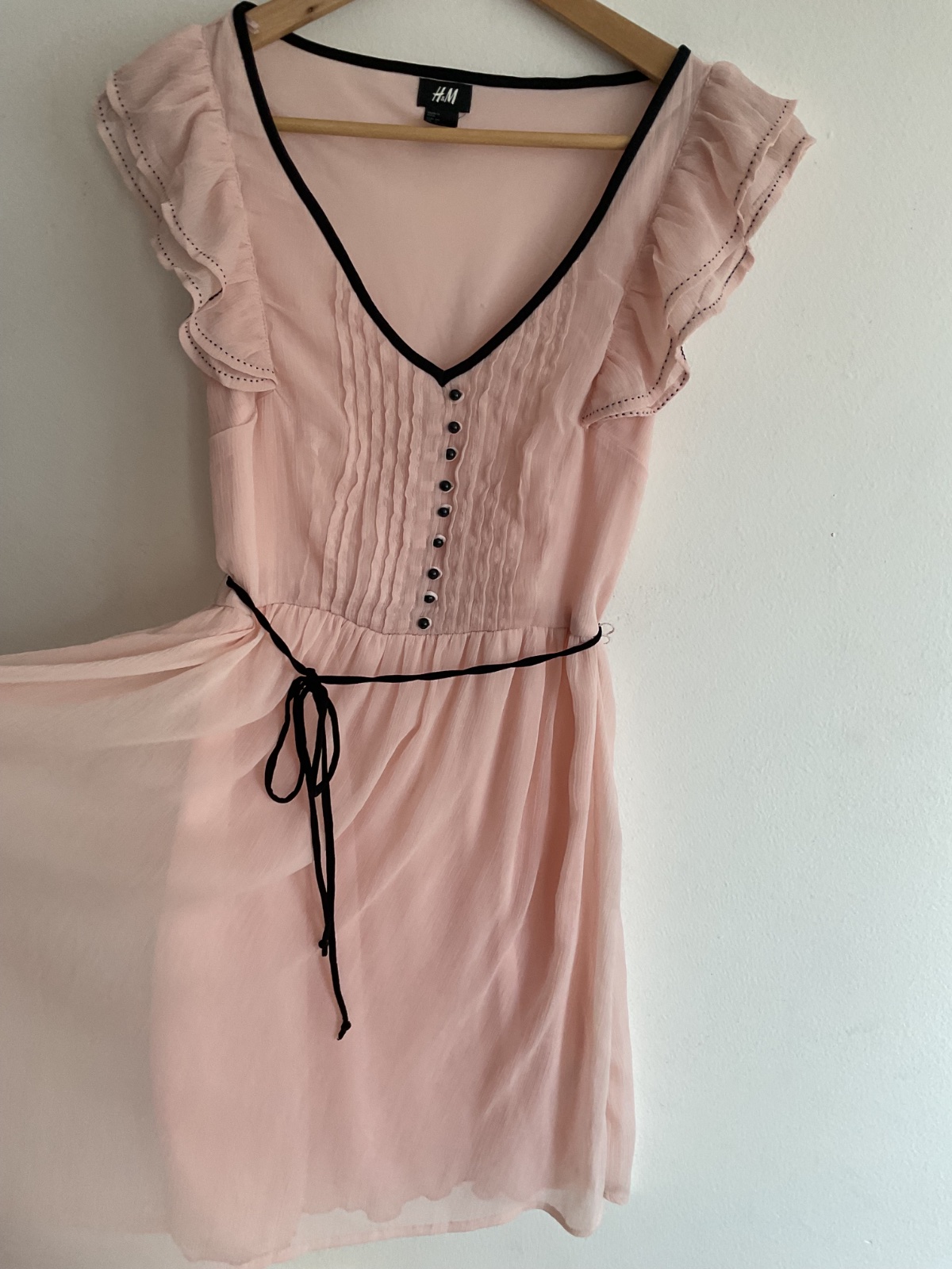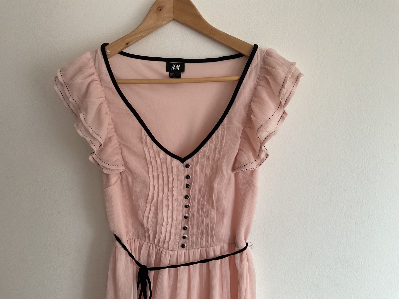 - ľahký materiál - s podšívkou - dvojitý volán na dekolte - pútka na opasok - zapínanie na zips a gombík na zadnej strane - rozšírená sukňa - dĺžka: 95 cm - šírka cez prsia: 40 cm - šírka v páse: 3...