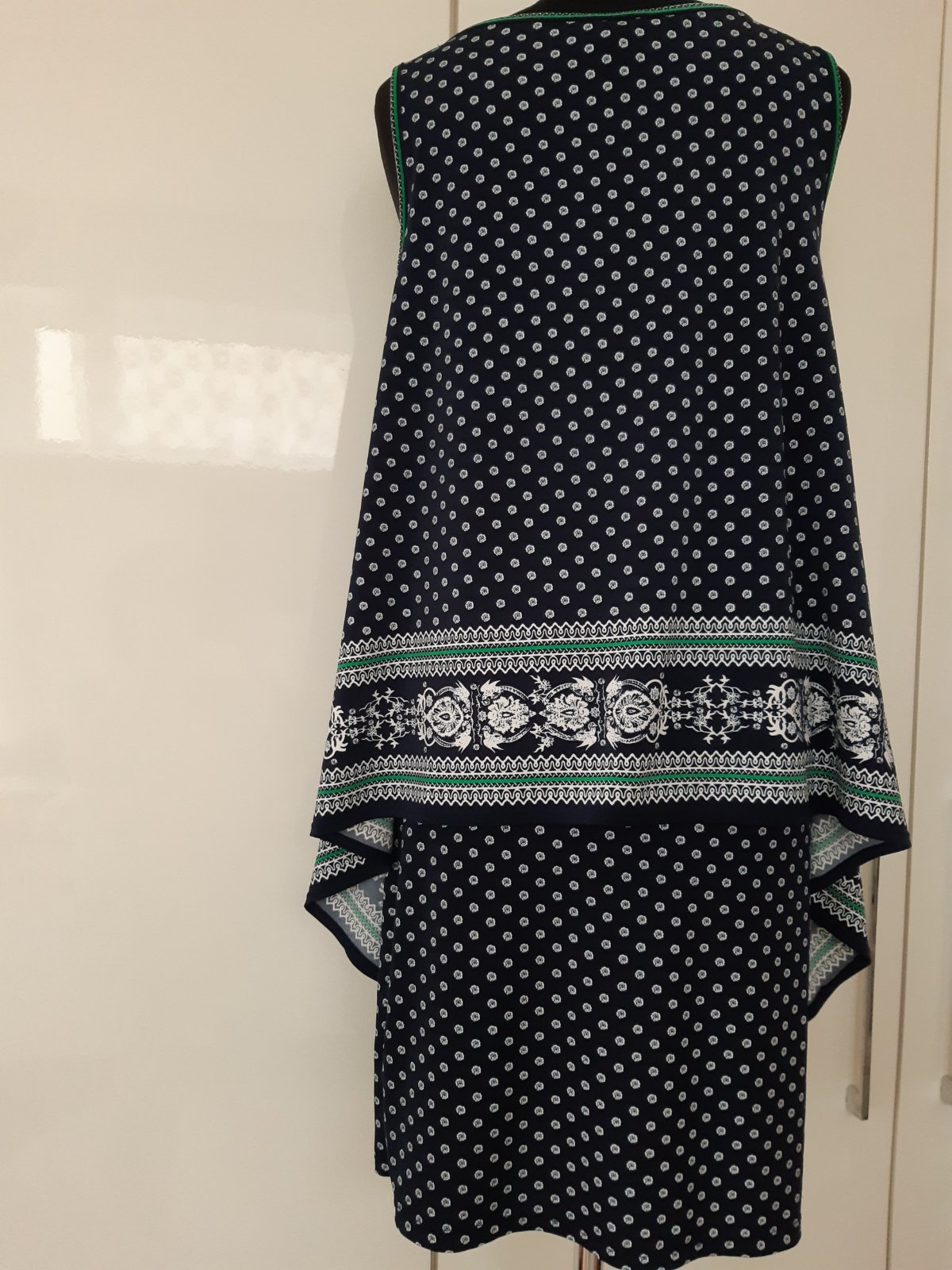 Šaty nosené minimálne iba na jednú sviatočnú príležitosť. Sú v súper stave, pekne sedia na postave, nevidieť známky použitia, sú perfektné, určite záujmu. DL. 90 cm, šírka v podpaži 49 x2 cm. Materiál 95% polyester, 5% elastan.