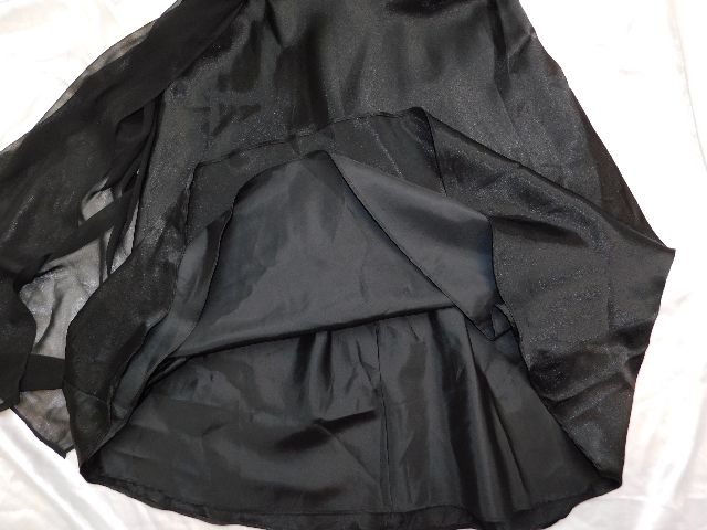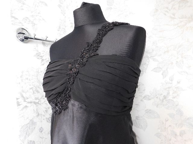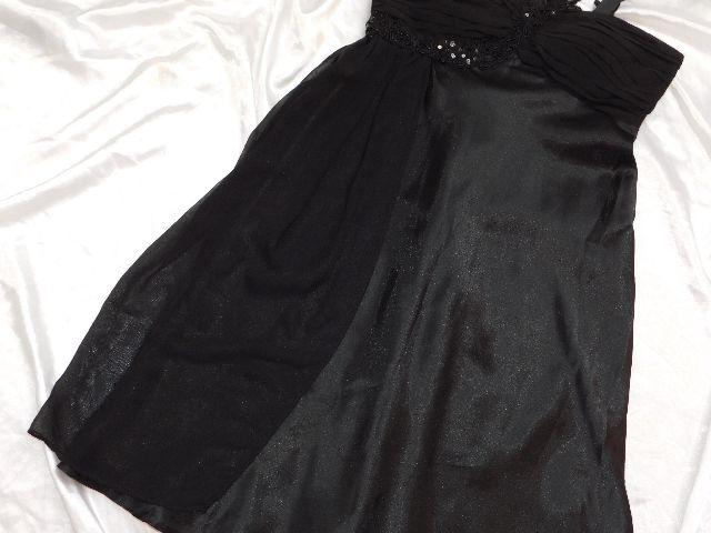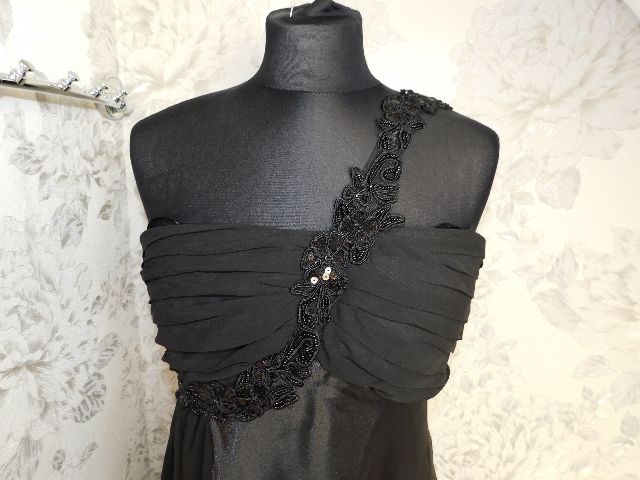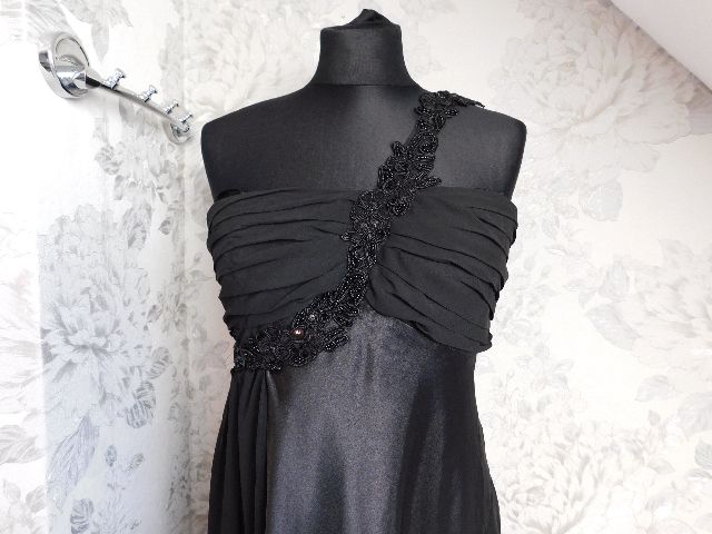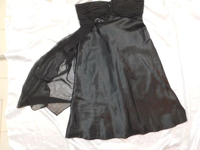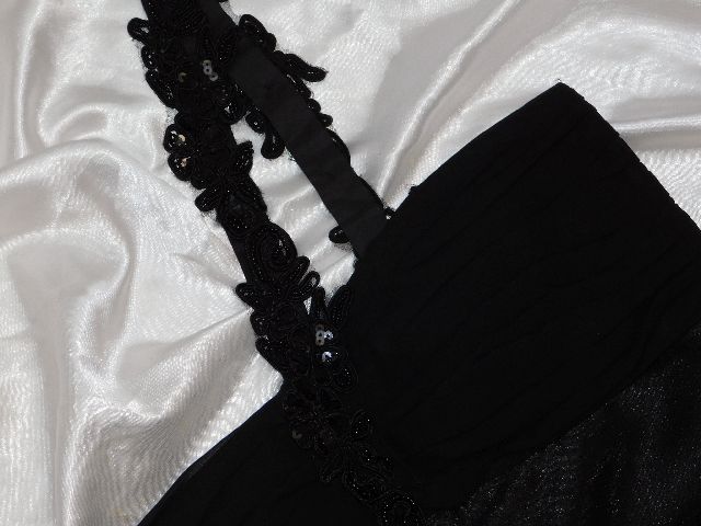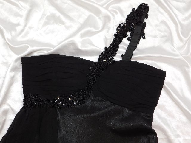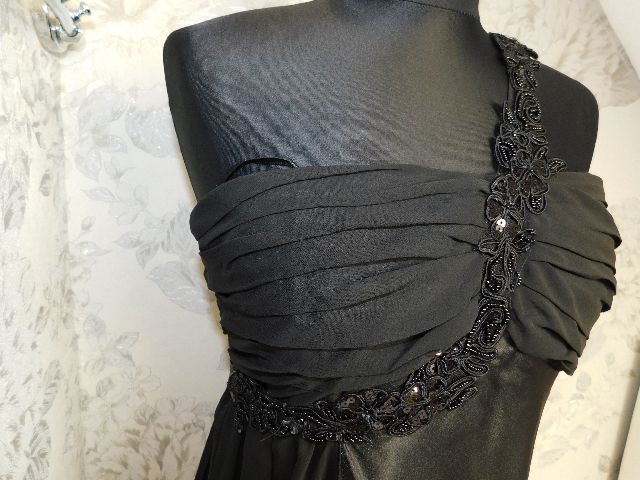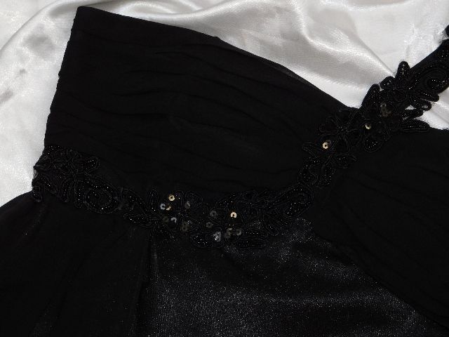 Pekne slavnostne saty,čiernej farby,s podsivkou,vpredu vystuzene,vzadu zapinanie na zips,ramenko zdobene flitrami a koralkami.100%polyester.super stav.