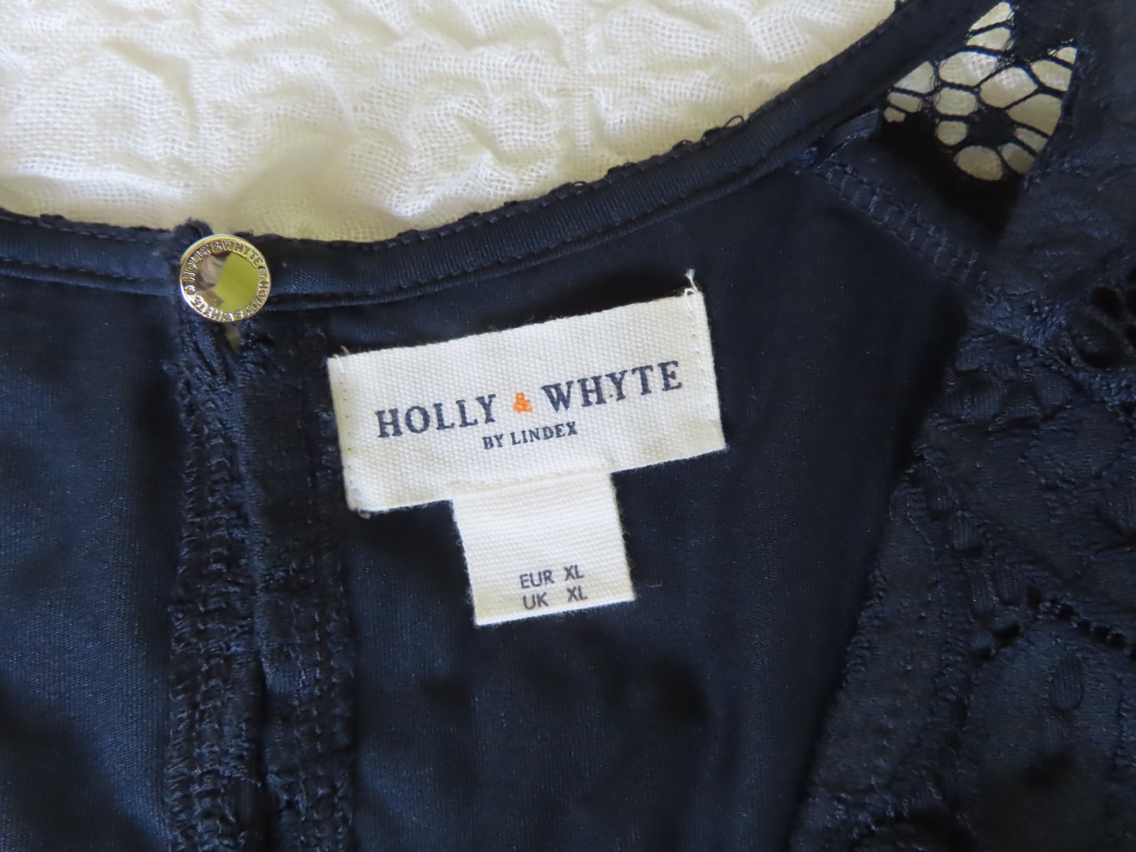Dámske krajové šaty Holly&Whyte by Lindex, veľ. XL - rozmery: dĺžka 103cm, pod pazuchami 2x53cm, pás 2x48cm. Kratučké rukávky spadnuté cez plecia.