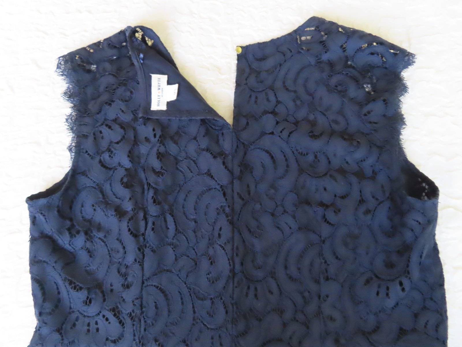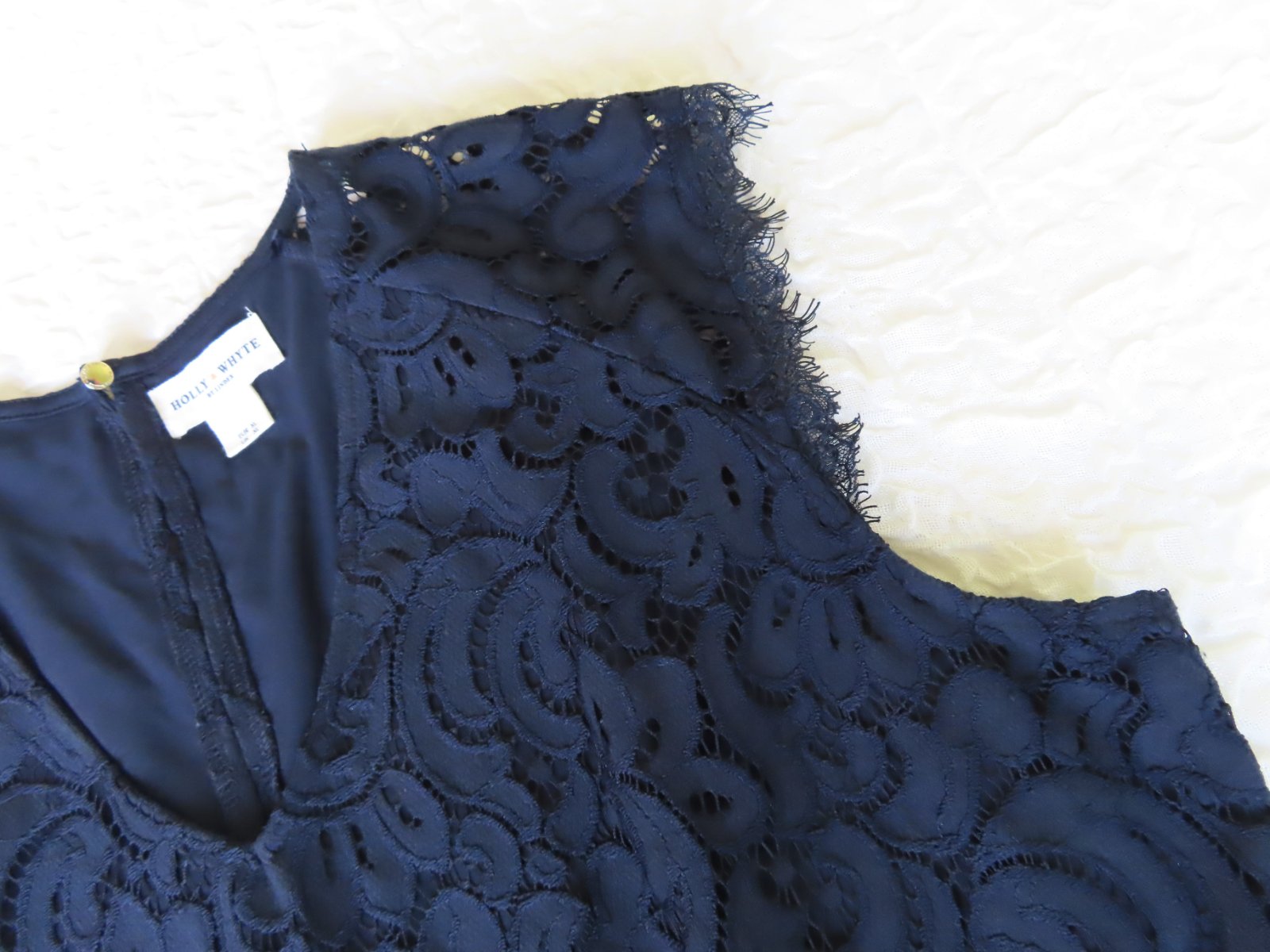 Klasické, mierne rozšírené, tmavomodré čipkované šaty na všetky slávnostné príležitosti tejto jari a leta. Šaty s véčkovým výstrihom majú krátke rukávky z čipky a kľúčovú dierku s gombíkom vzadu. Noste ich spolu s podpätkami alebo úzkymi nohavicami v závislosti od vašej nálady a osobného štýlu.