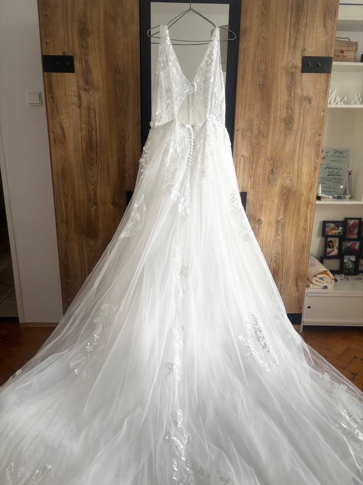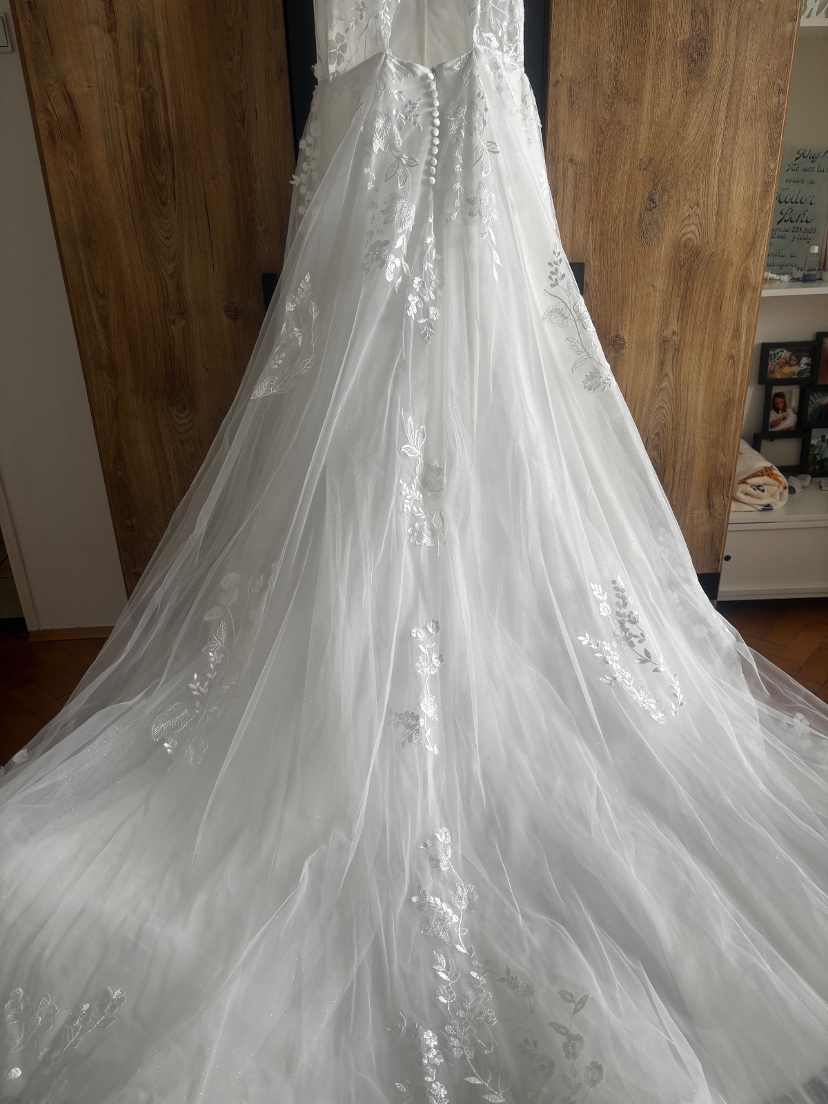 Biele svadobné šaty profesionálne vyčistene v čistiarni. Super sedia na postave. Vdaka snurovacke na chrbte sa skvele prisposobia postave S-M-L - moja vyska je 170 cm • Sukňa sa sklada zo 6 tylov,...
