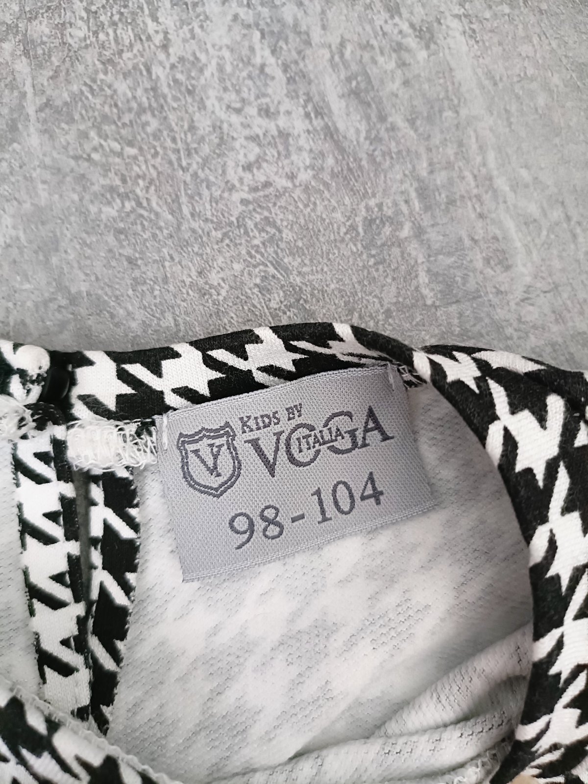 Krásne dievčenské šaty s motívom kohutej stopy . V páse gumička , dva volant zdobené ciernymi brnbolcami ,zapínanie na gombík vzadu
