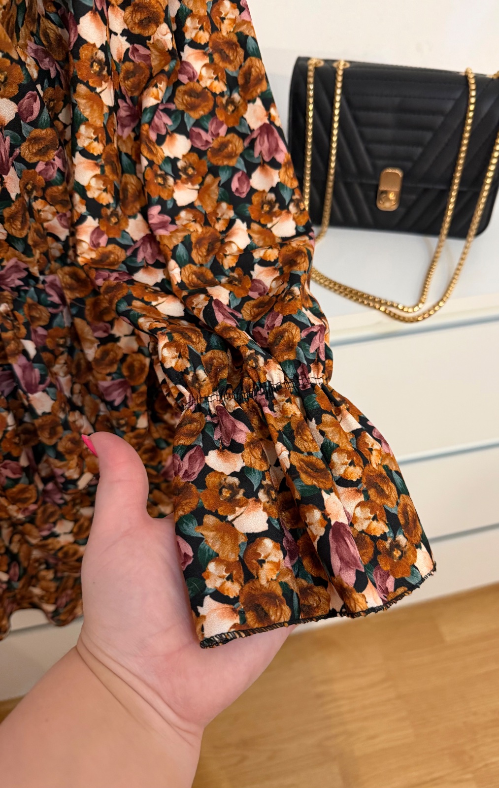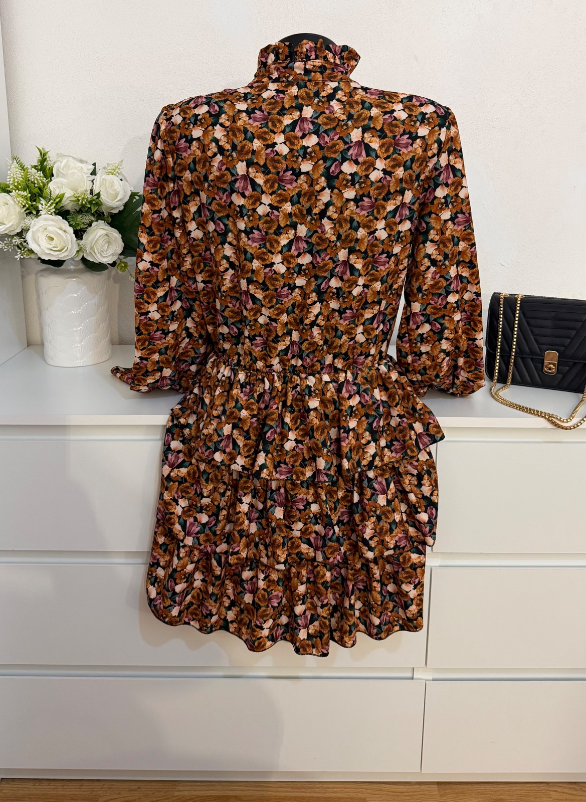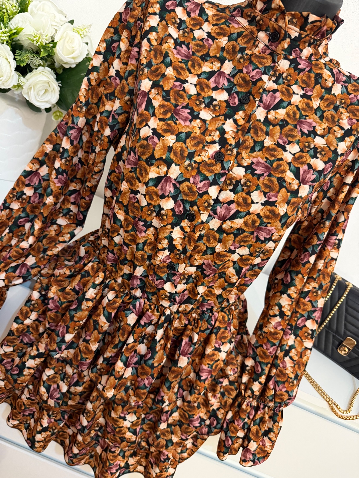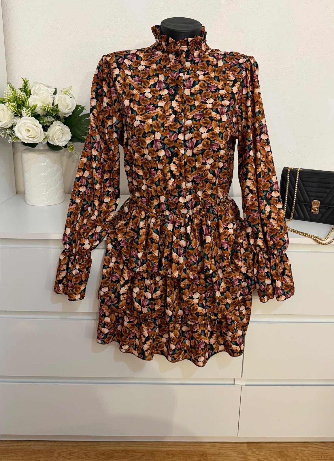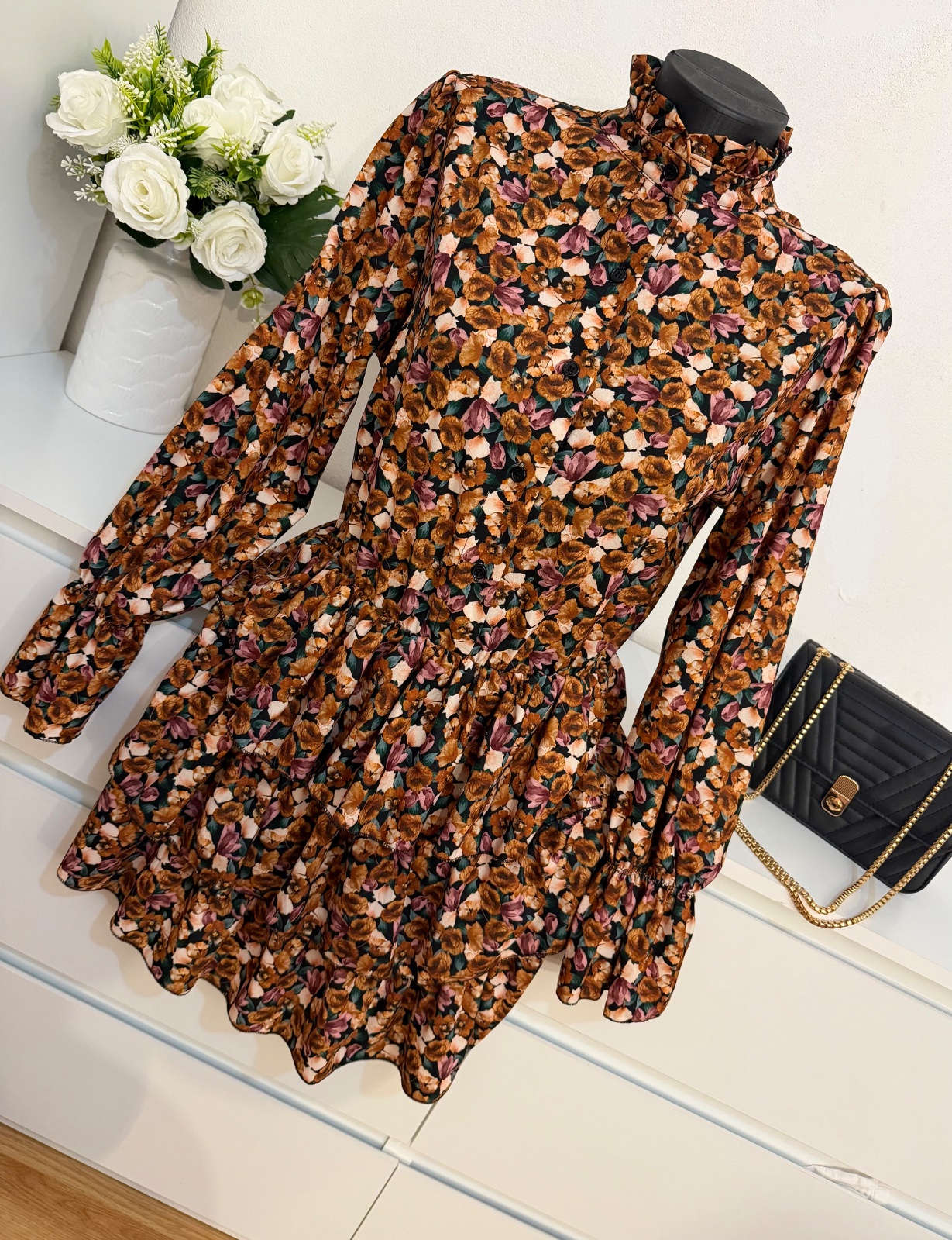 Jemný kvetinový vzor v teplých zemitých tónoch pôsobí veľmi elegantne a nadčasovo ✨ Strih krásne zvýrazní postavu a zároveň je pohodlný na nosenie.
