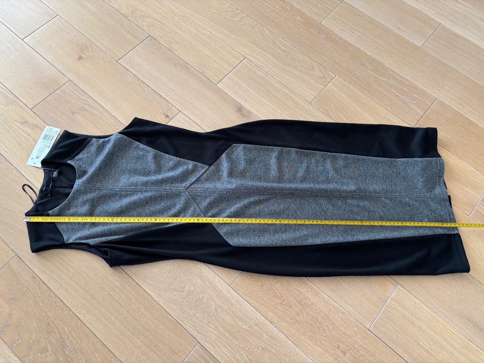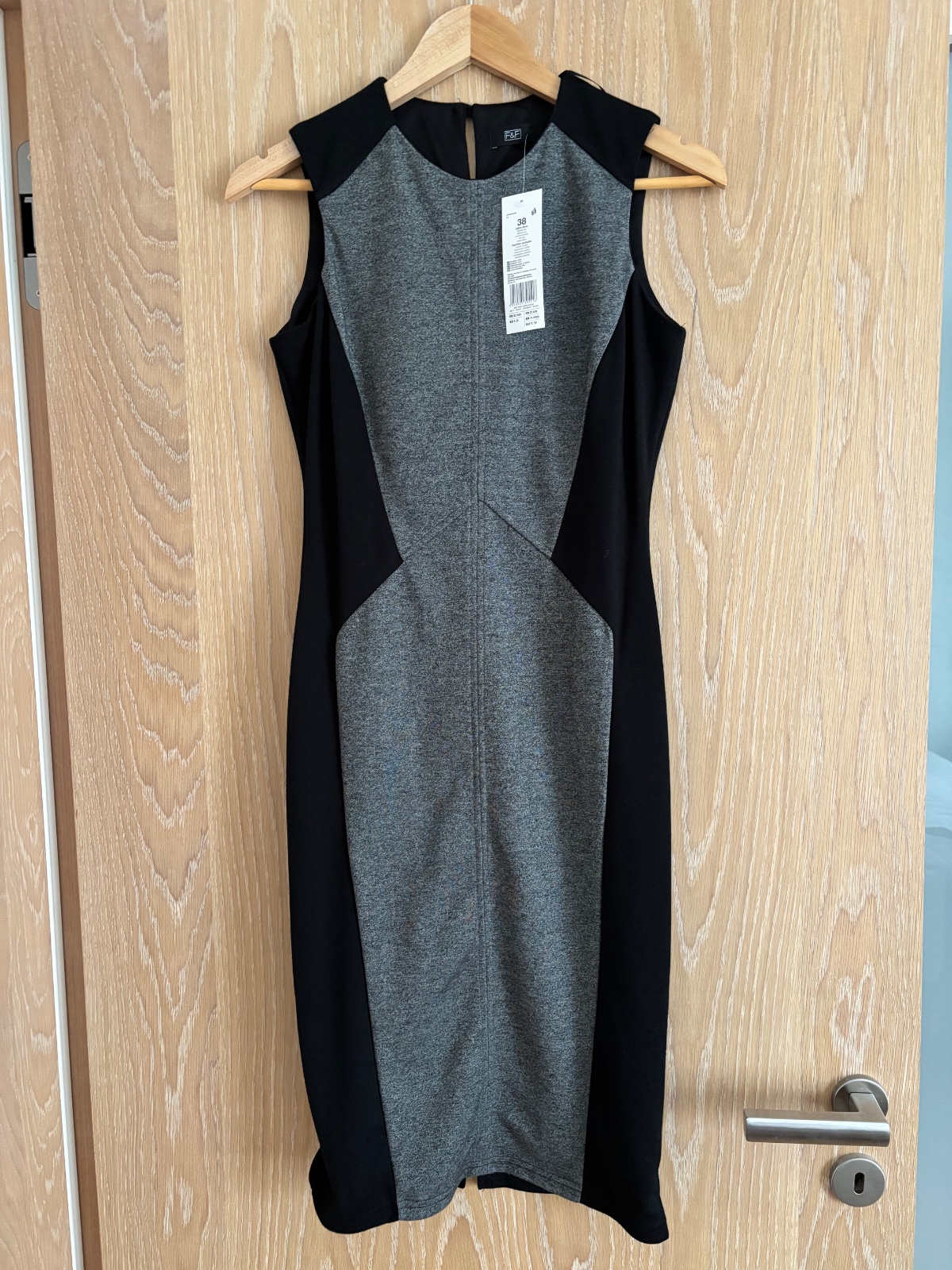 Predam nove saty este s visackou vel. 38. Vzor, kedy bocna strana je cierna a len stred sedy ma zostihlovaci efekt, ked su oblecene. Vzadu v strede mierny rozparok.