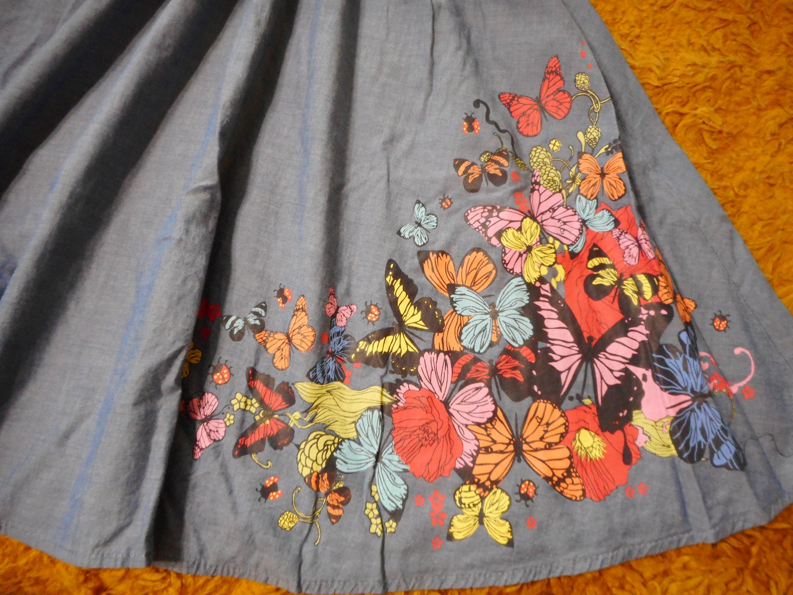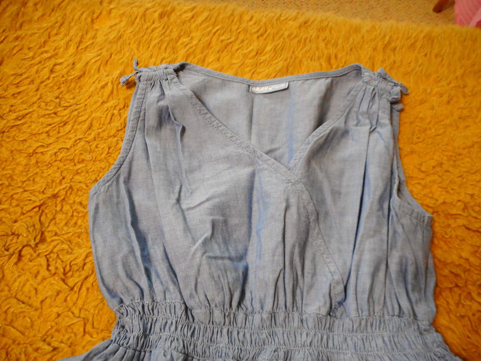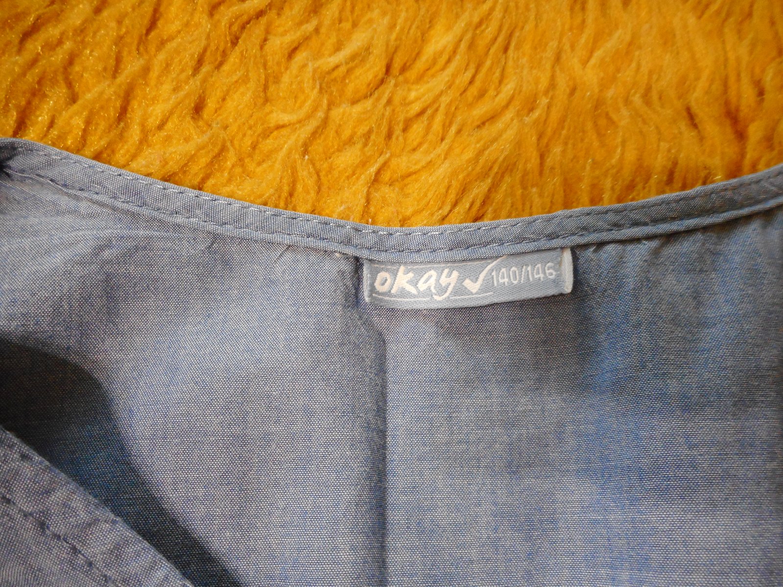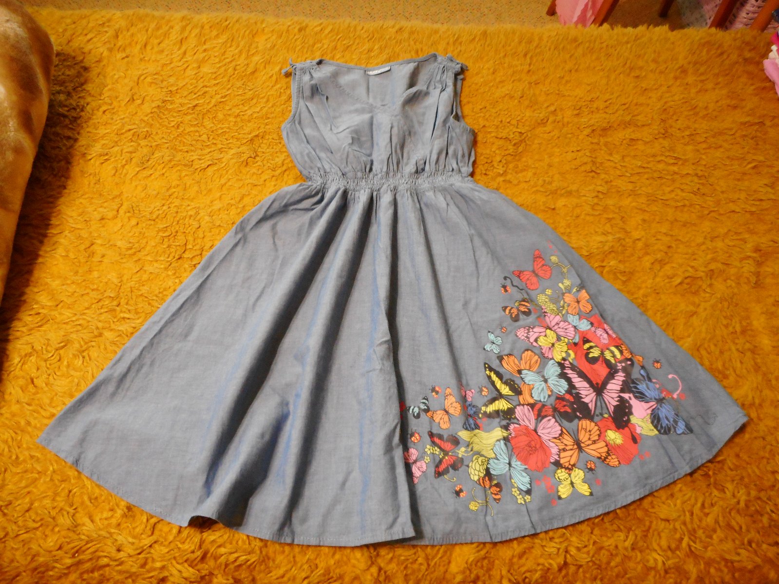 predám používané, nepoškodené ľahučké dievčenské riflové šaty zn. Okay veľkosť 140/146cm bez rukávov, svetlomodrej látky s gumičkovým pásom, suknička široká s krásnou aplikáciou motýľou, celková dĺžka šiat je 76cm, pás v kľude je 25cm, ešte sa natiahne , dĺžka sukne od pásu dolu je 46cm