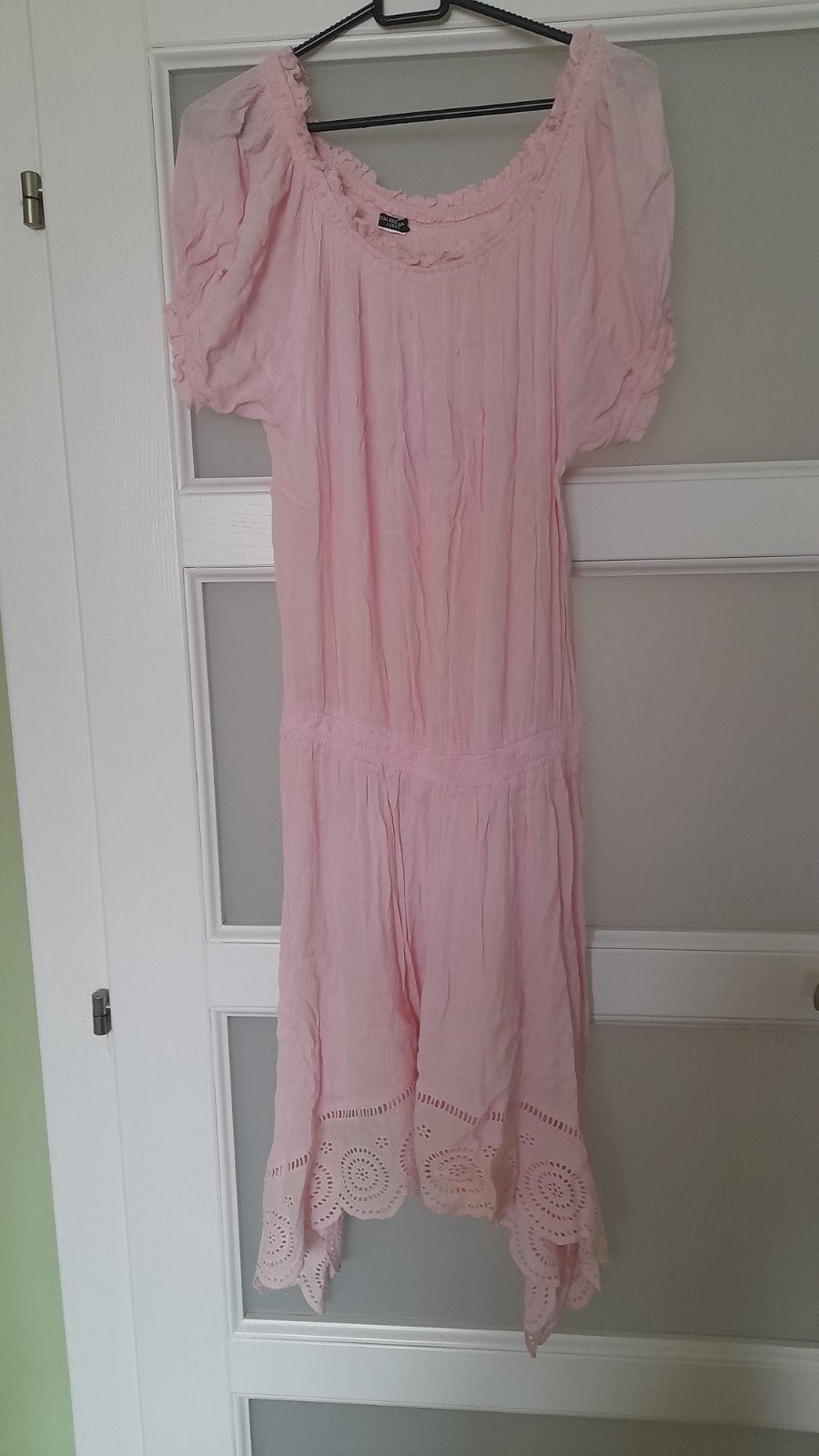 Krásne,ruzove saty asymetrické, kombinovane s madeirov,veľmi príjemné na leto,môžu sa nosiť cez ramená, gumička v páse nosím väčšinou M ...ale aj L značka Calzedonia....