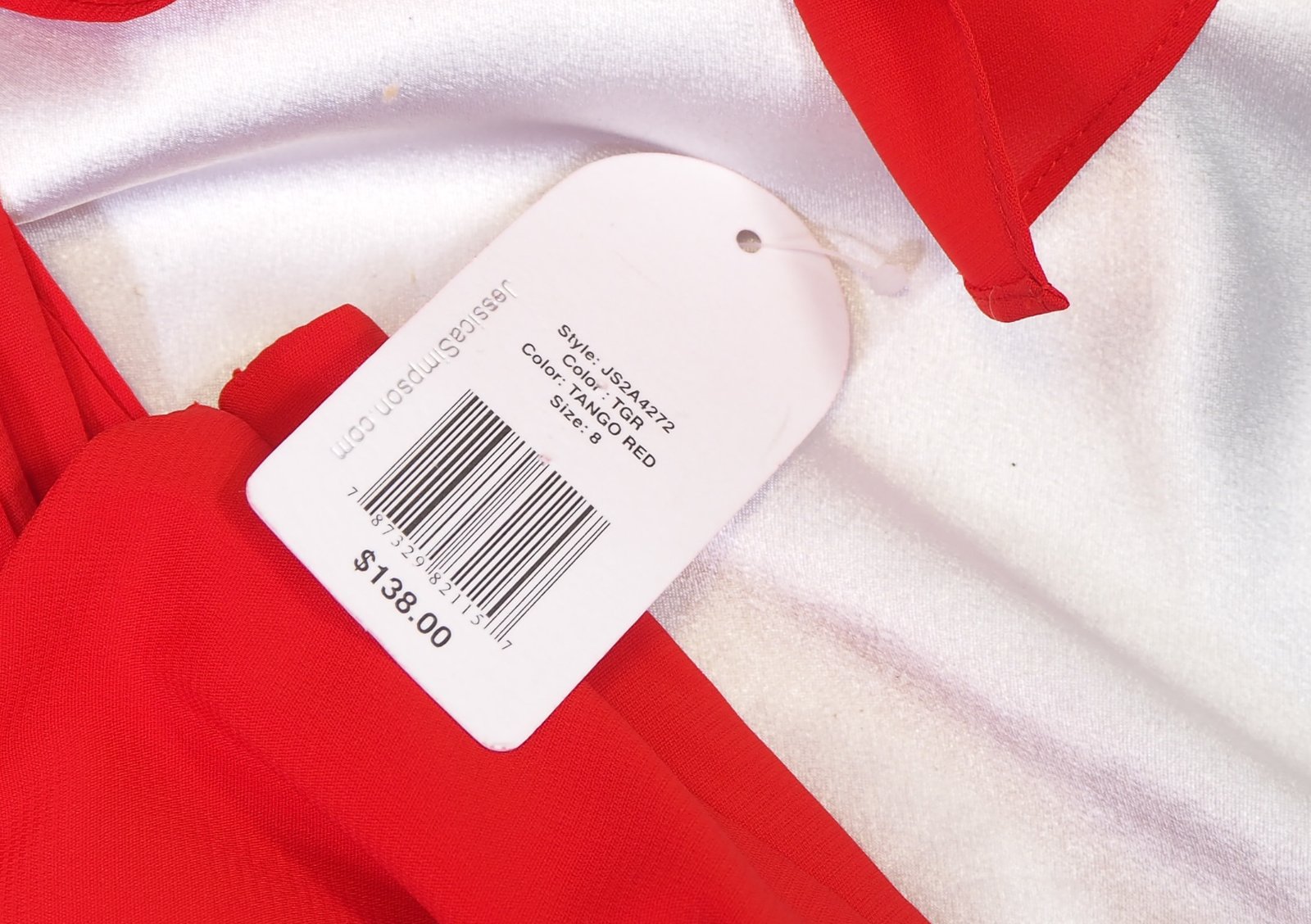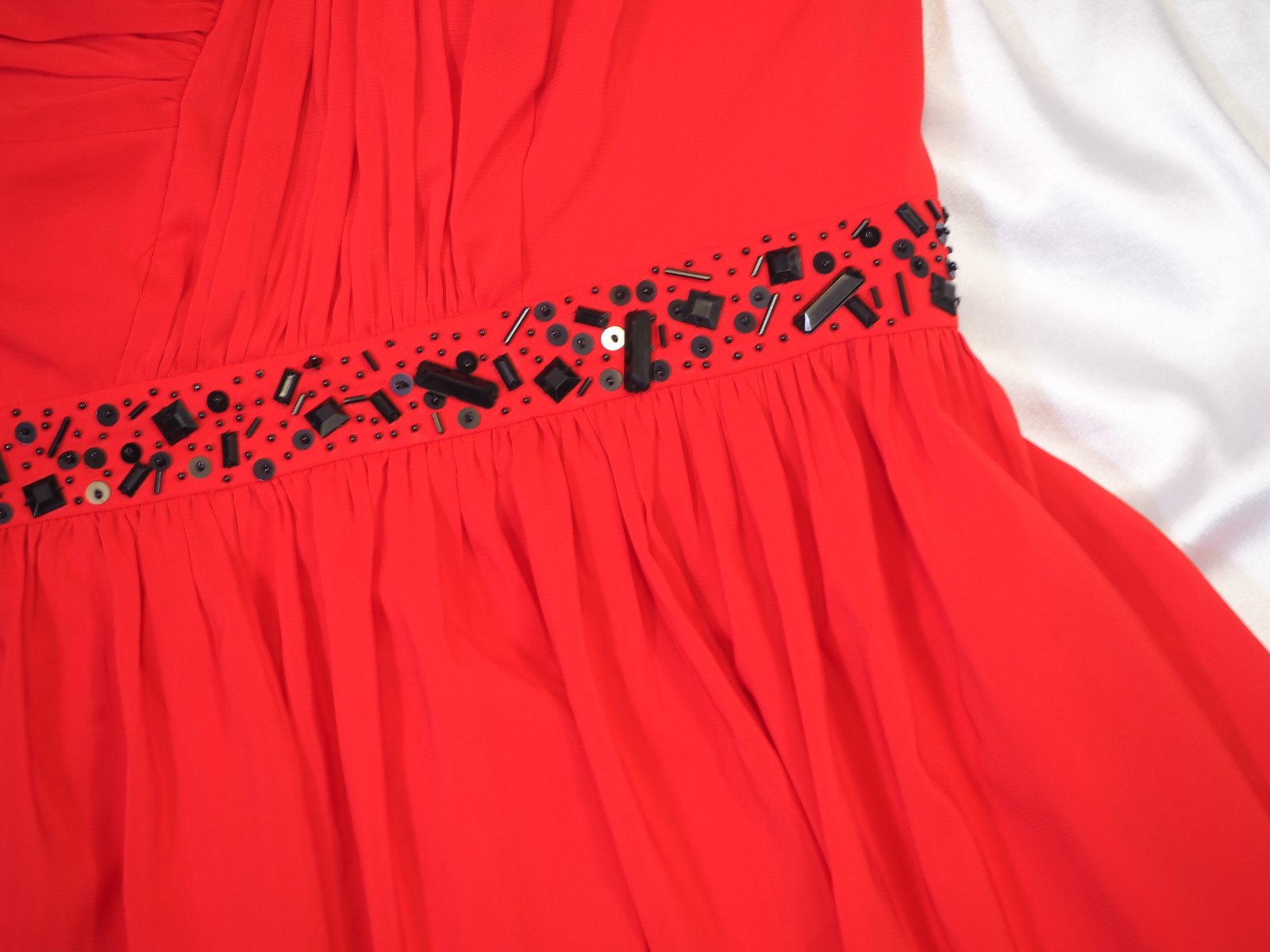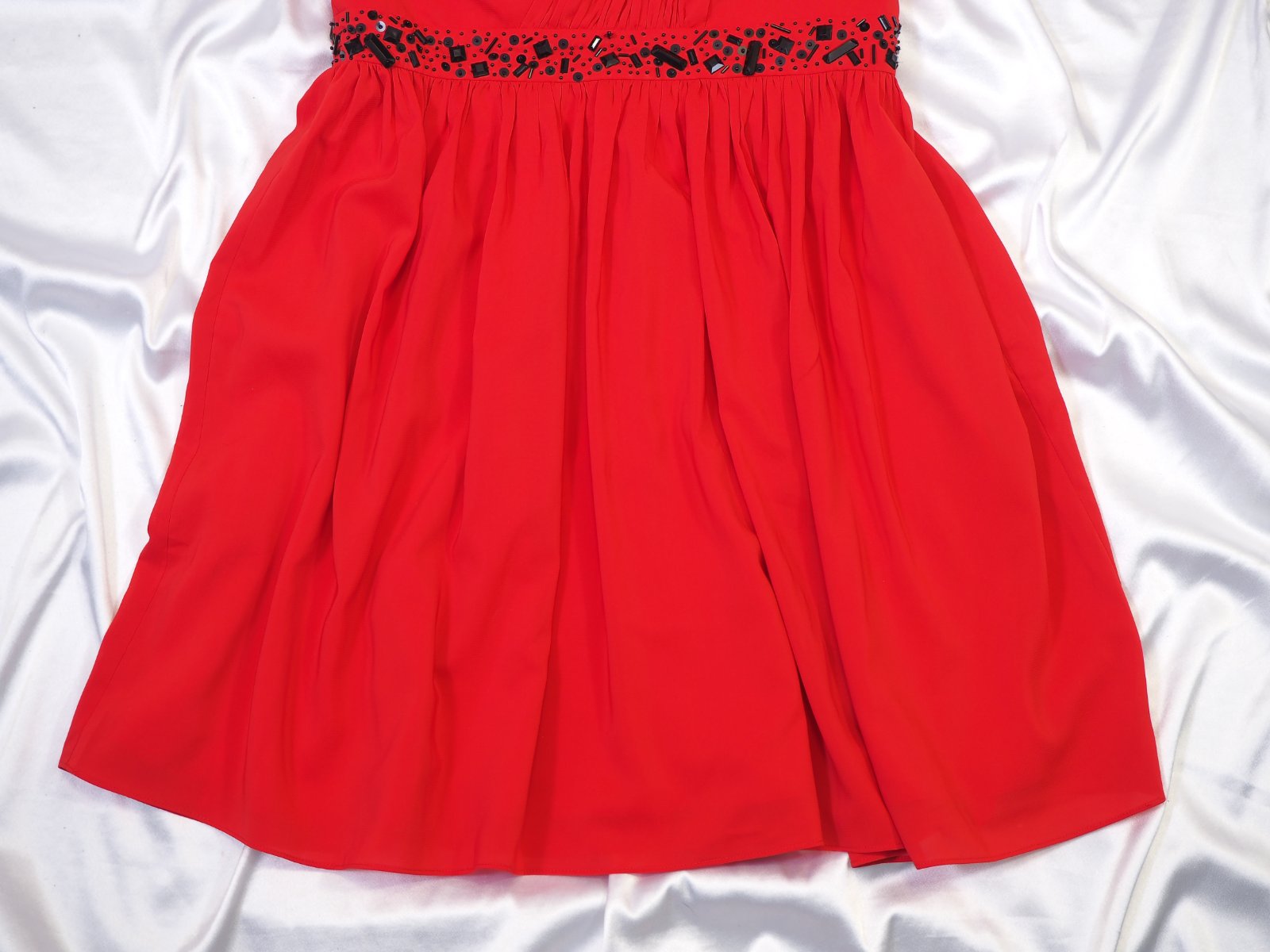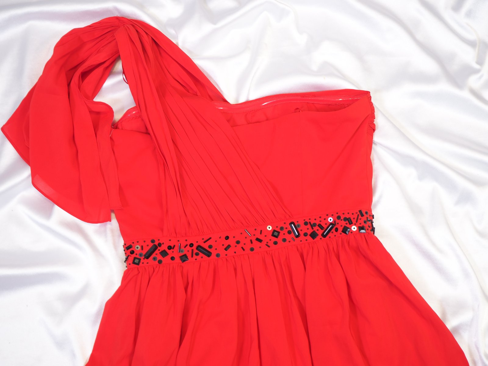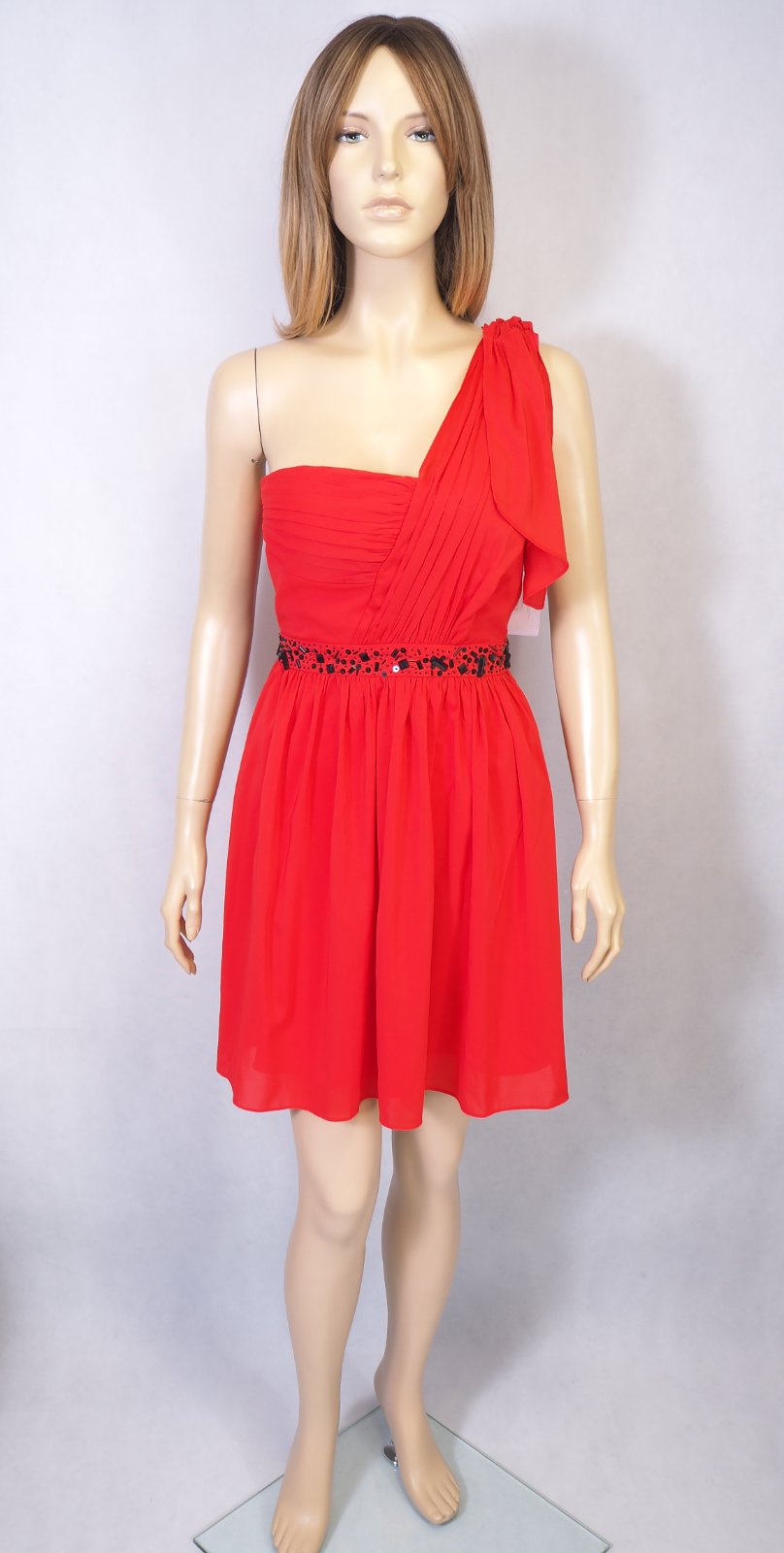 Luxusné elegantné šaty červenej farby s jedným ramenom, bočné zapínanie, podšité, pás zdobený čiernymi kamienkami, materiál 96% polyester, 4% elastan, nové s visačkou.