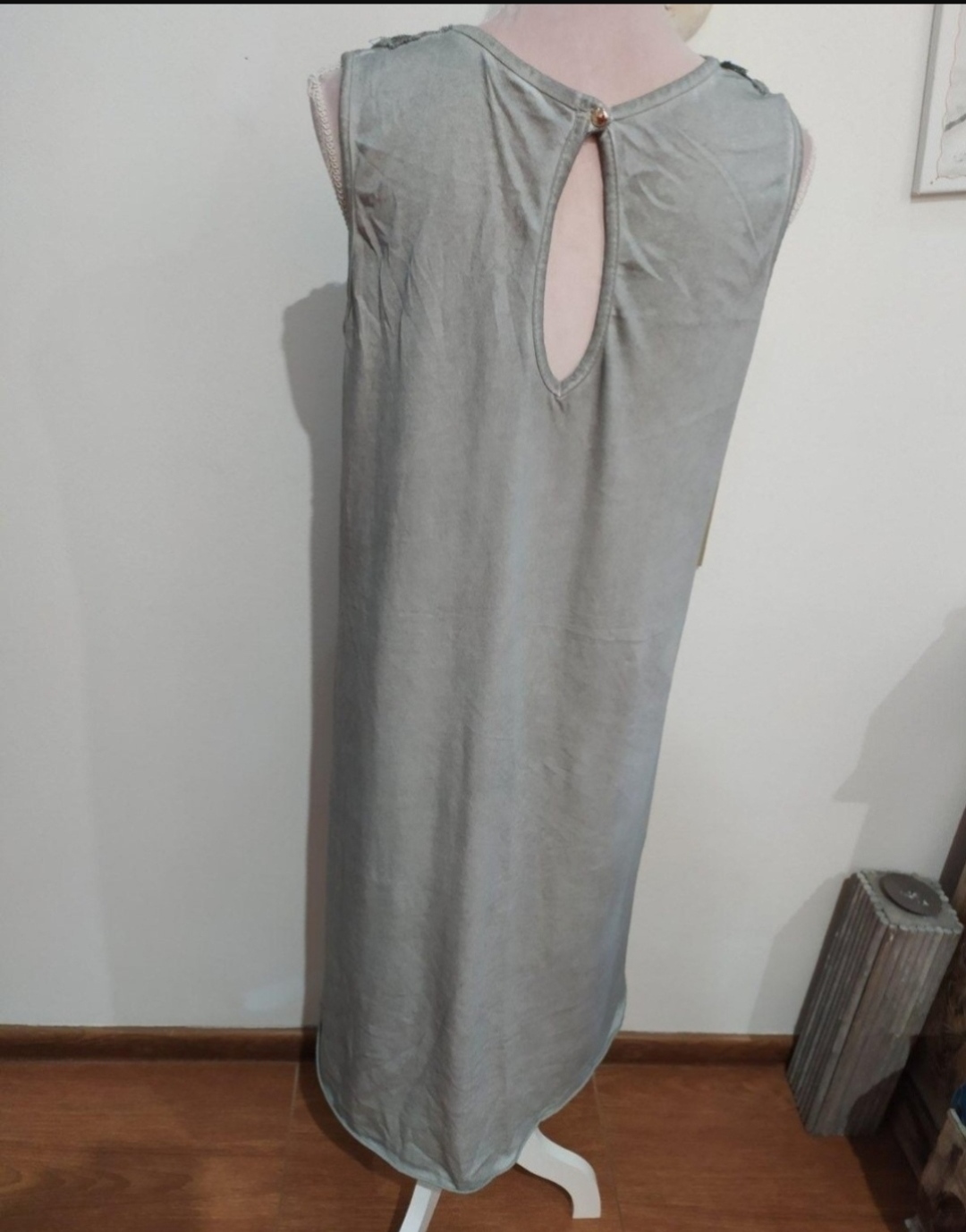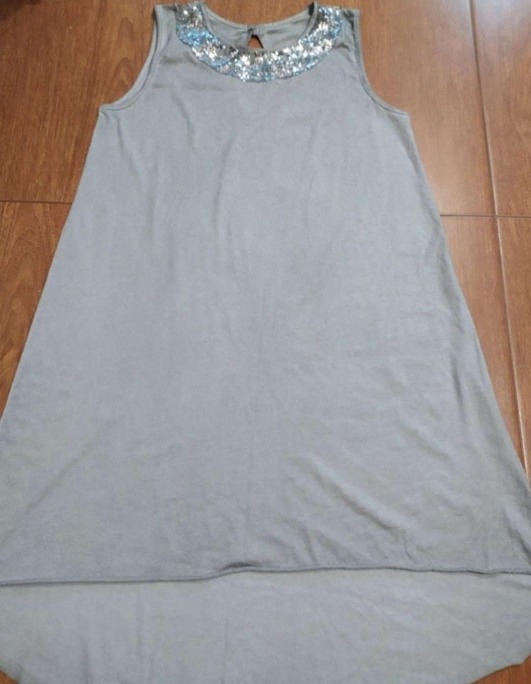 veľ. univ. odhadom S/M Sivé zaujímavé šaty, bez rukávov. Hra materiálu – tričkovina + tyl. Okrúhly výstrih, prestrihnuté v pase – na gumičku, sukňa so strihom do A. Zapínanie na gombíky. Na spodk...