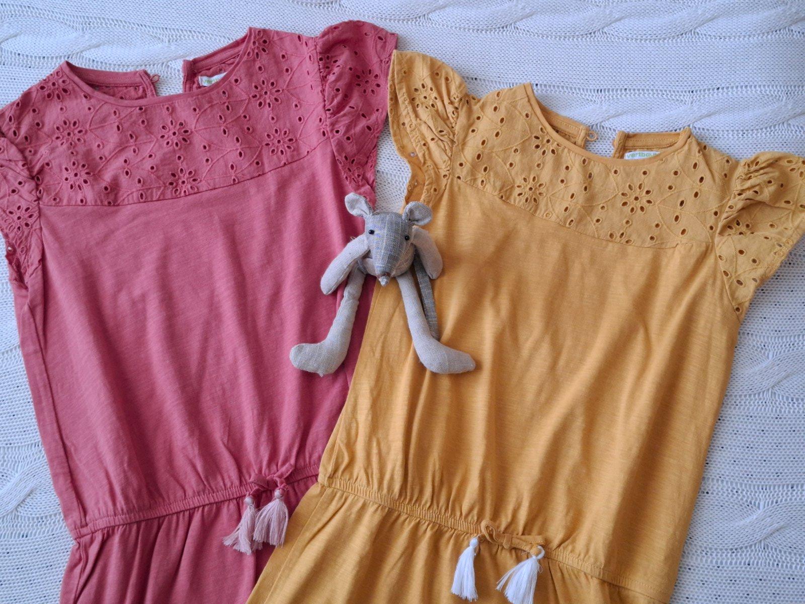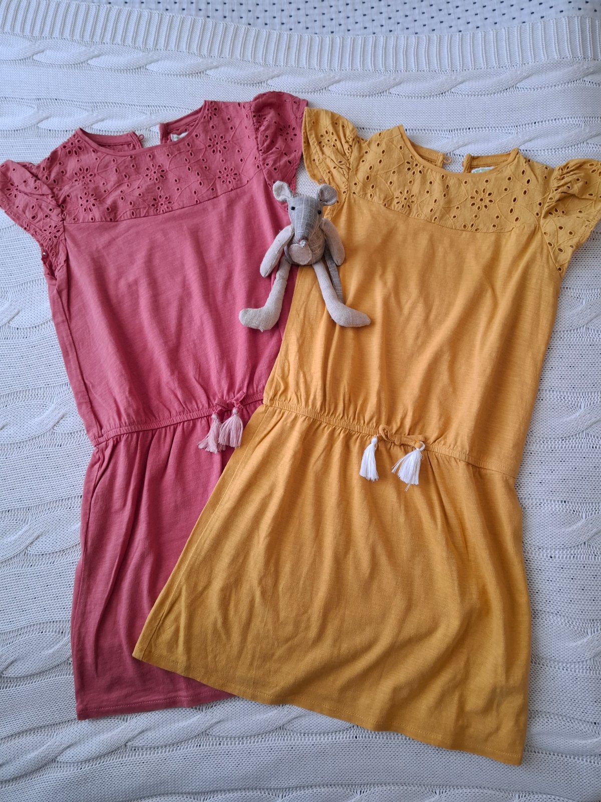 Krásne šaty značky Vertbaudet, pár krát oblečené, v top stave bez poškodenia. Ako nové. Veľkosť uvedená 140, ale táto značka zvykne mať menšie veci, dcérka ich nosila pri veľkosti 134. Cena za obidve spolu