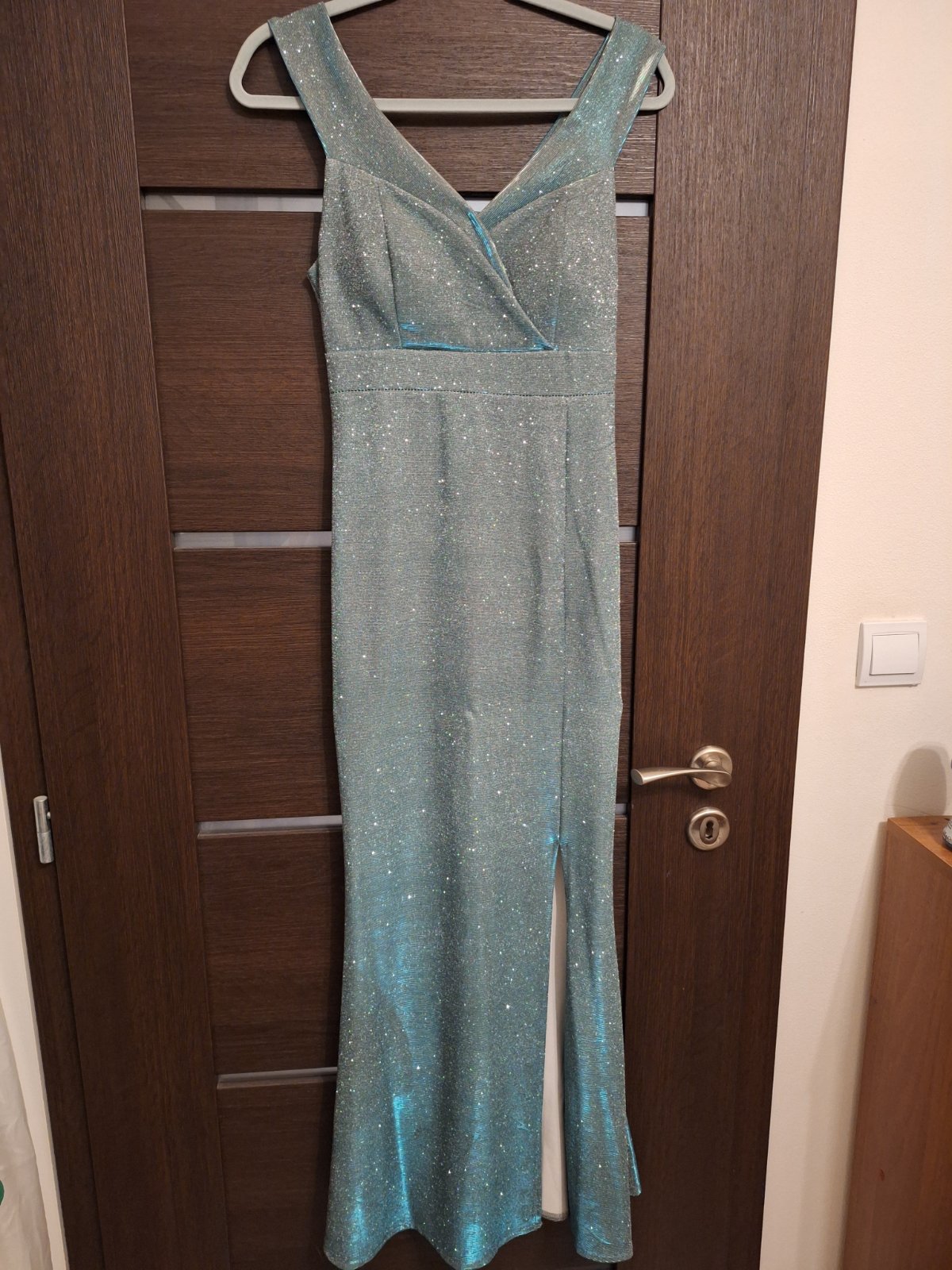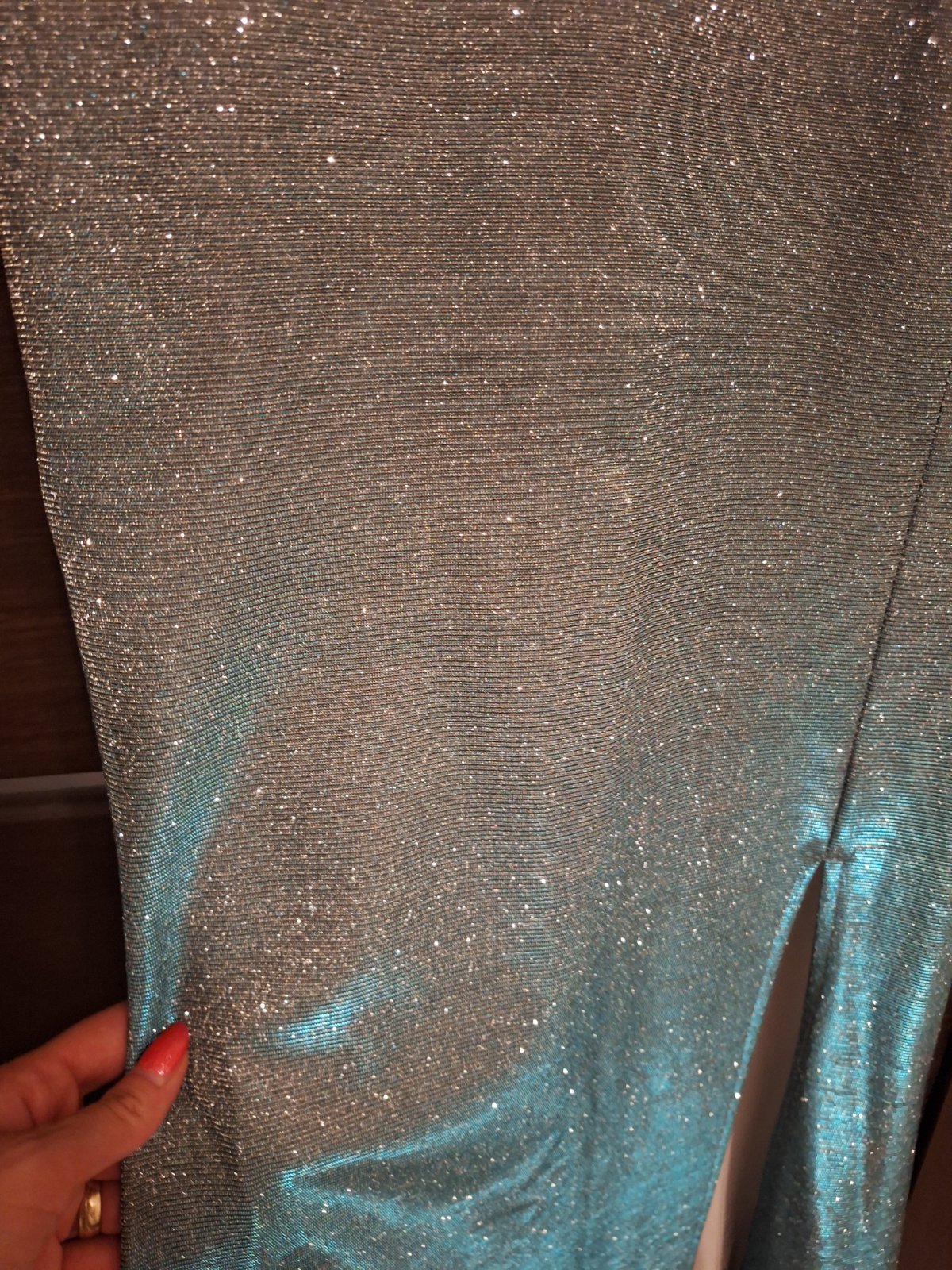 Šaty na ples, stužkovú, svadbu. Trblietavé, mierne elastické s rozporkom. Majú vystužené prsia. Zapínanie na zips na chrbte. Menia odlesk, strieborno tyrkysové.