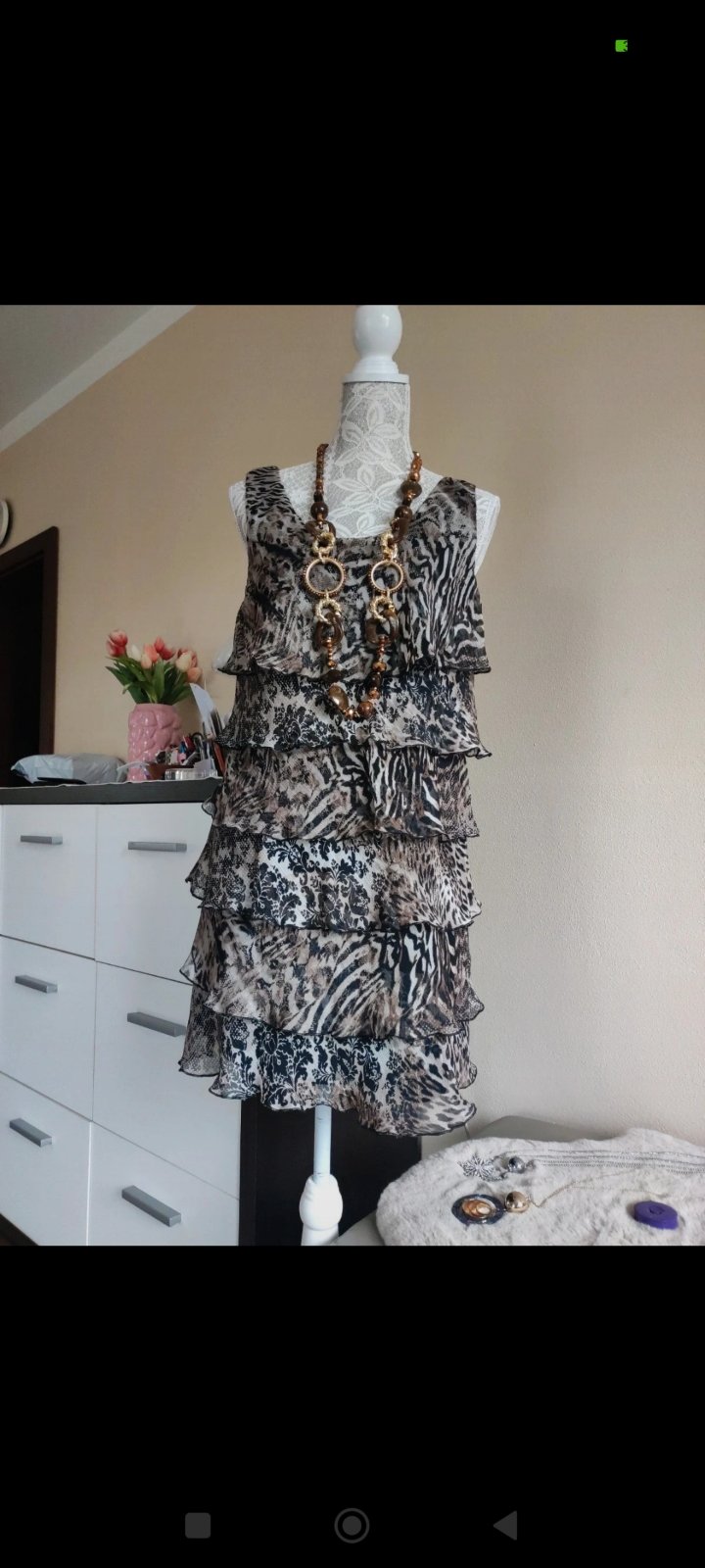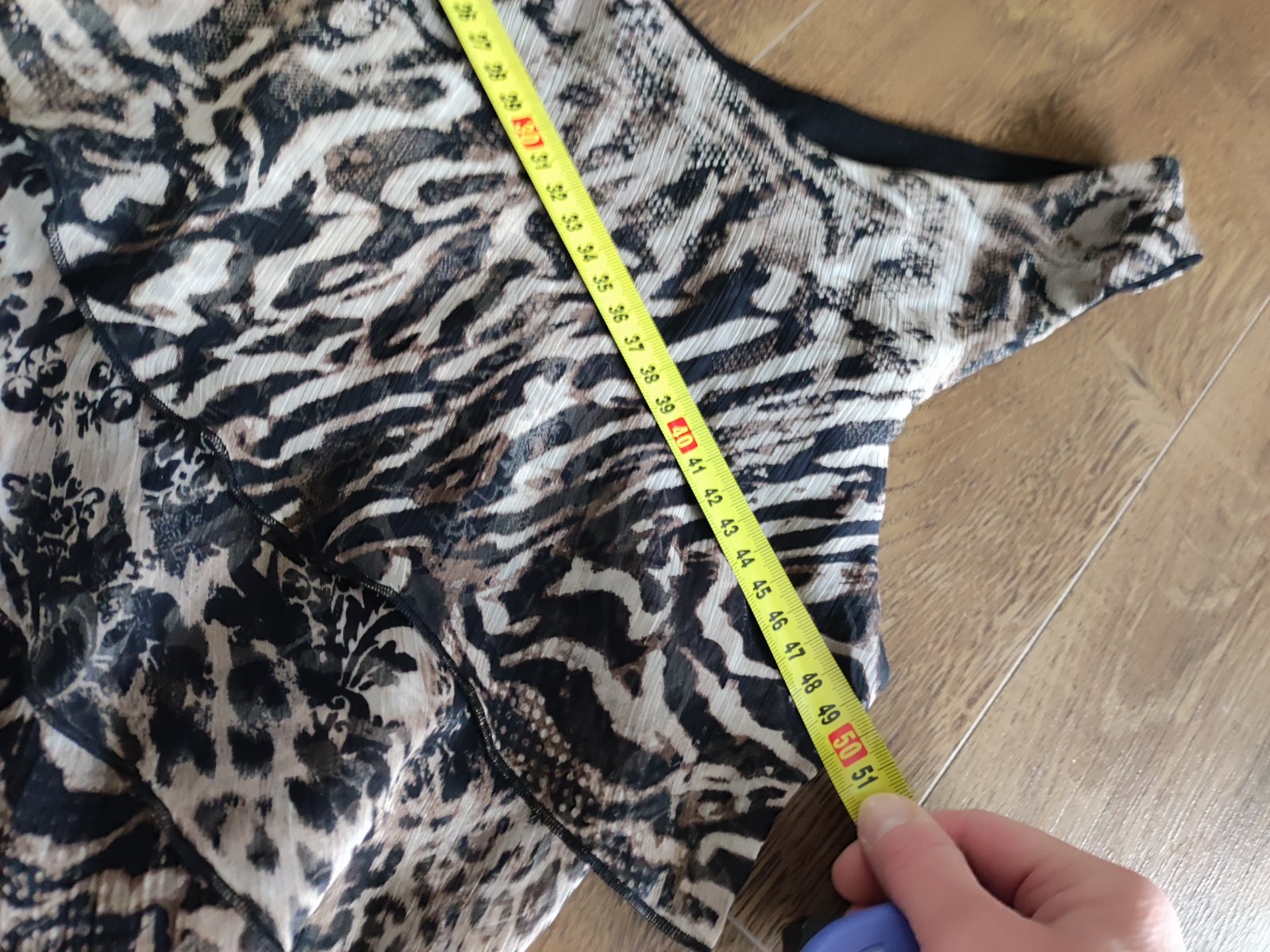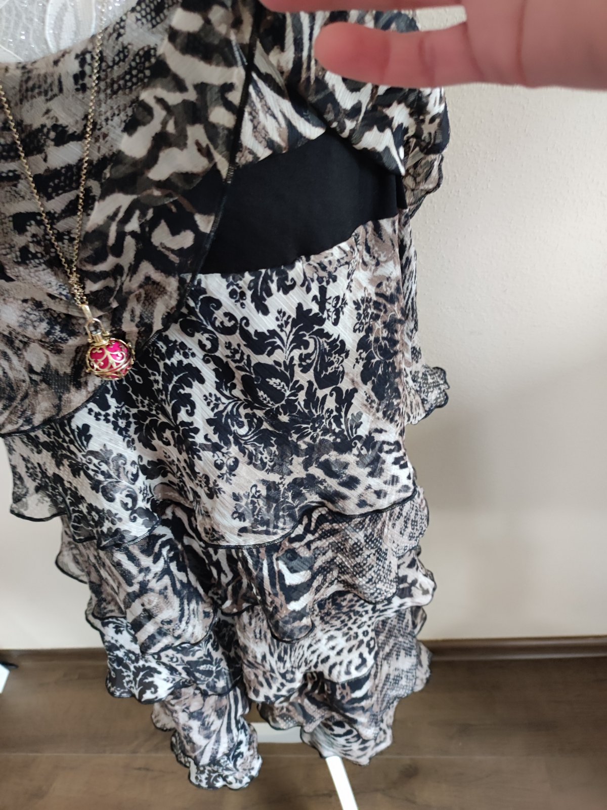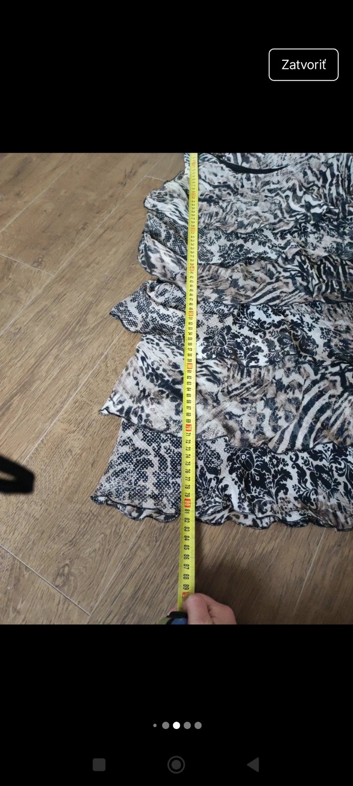 Bez poškodení, dĺžka 89cm, šírka cez prsia 42 cm, v páse gumička, elastický materiál, sedia na v. 36-38.