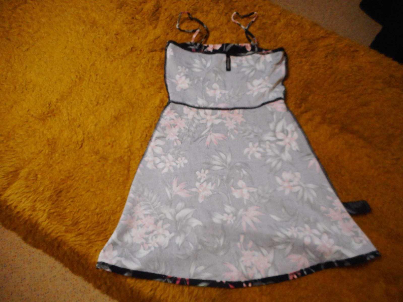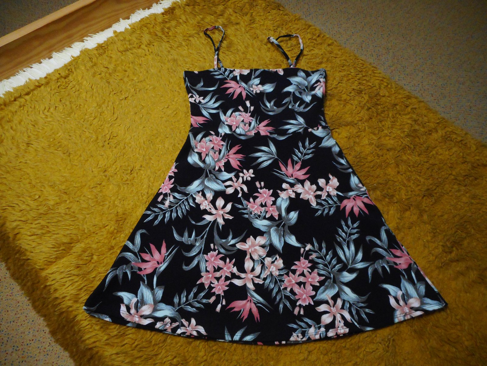 predám používané nepoškodené dievčenské letné sexi šaty na ramienka pre slečnu zn. Divided H&M veľkosť podľa štítku detská 36, reálne zodpovedá veľkosť 140cm-146cm, prestrihnuté v páse, čiernej farby s potlačou kvetou, ramienka sa dajú v prípade potreby upraviť previazaním, celková dĺžka šiat bez ramienok je 62cm plus ramienka najviac natiahnuté 20cm, teda aj s ramienkami 82cm, pás 33cm, šírka pod pazuchami je 35cm