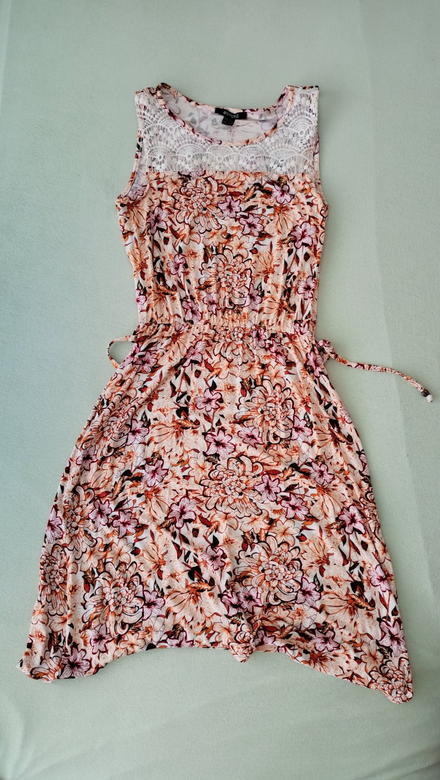 Bavlnené šaty sú nosené veľmi málo. Výrobca Esmara, veľkosť XS. Na hrubšie ramienka, v páse gumička a opasok. Dĺžka 93 cm.
