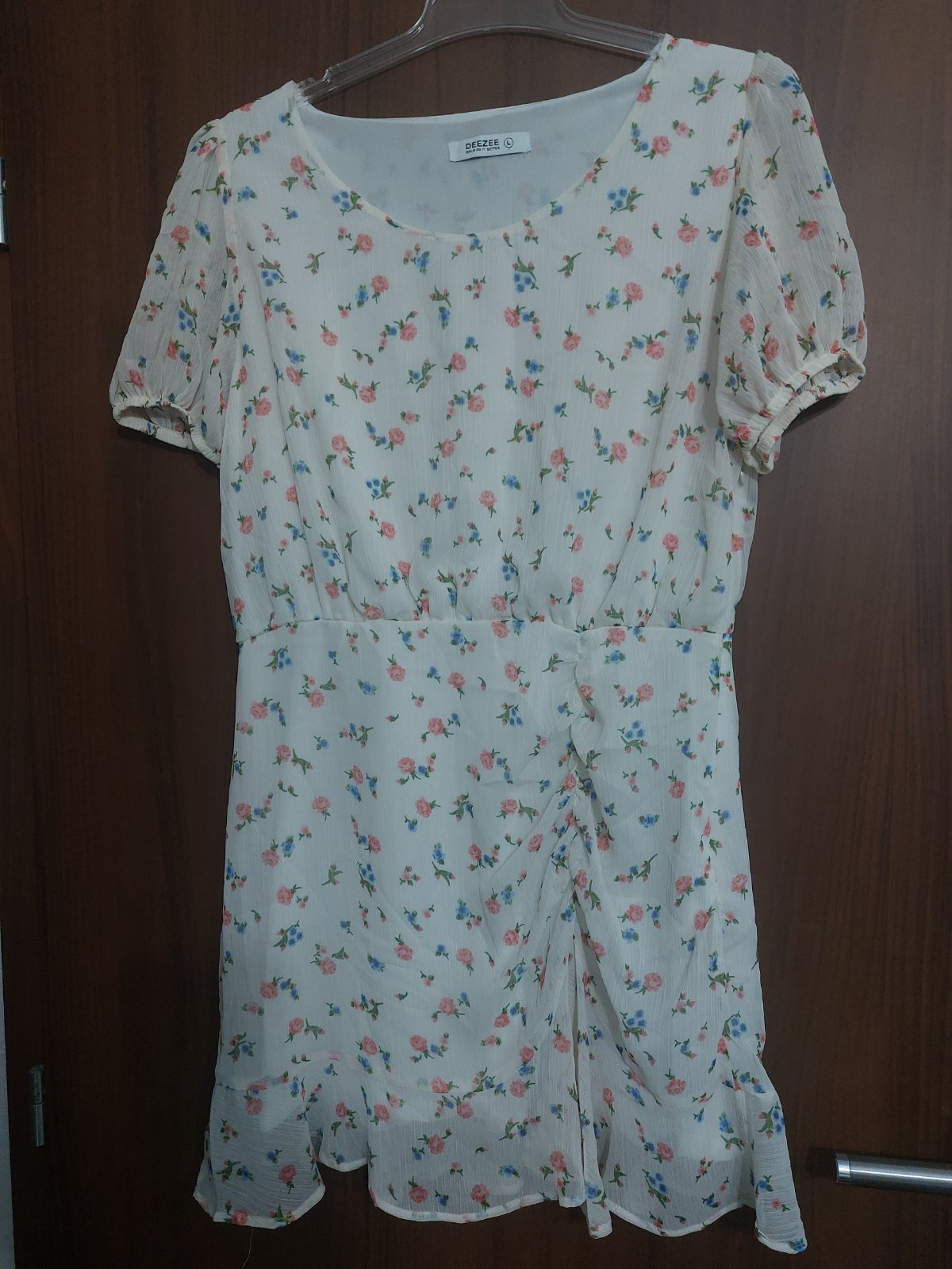 Dámske vzorované šaty s krátkym rukávom, tunika. Nie sú elastické. Materiál 65%bavlna,35%polyester. Veľkosť UNI (vhodná pre M,L,XL). Krajina pôvodu: ČĽR. ROZMERY: dĺžka:85cm, od pazuchy dĺžka dole...