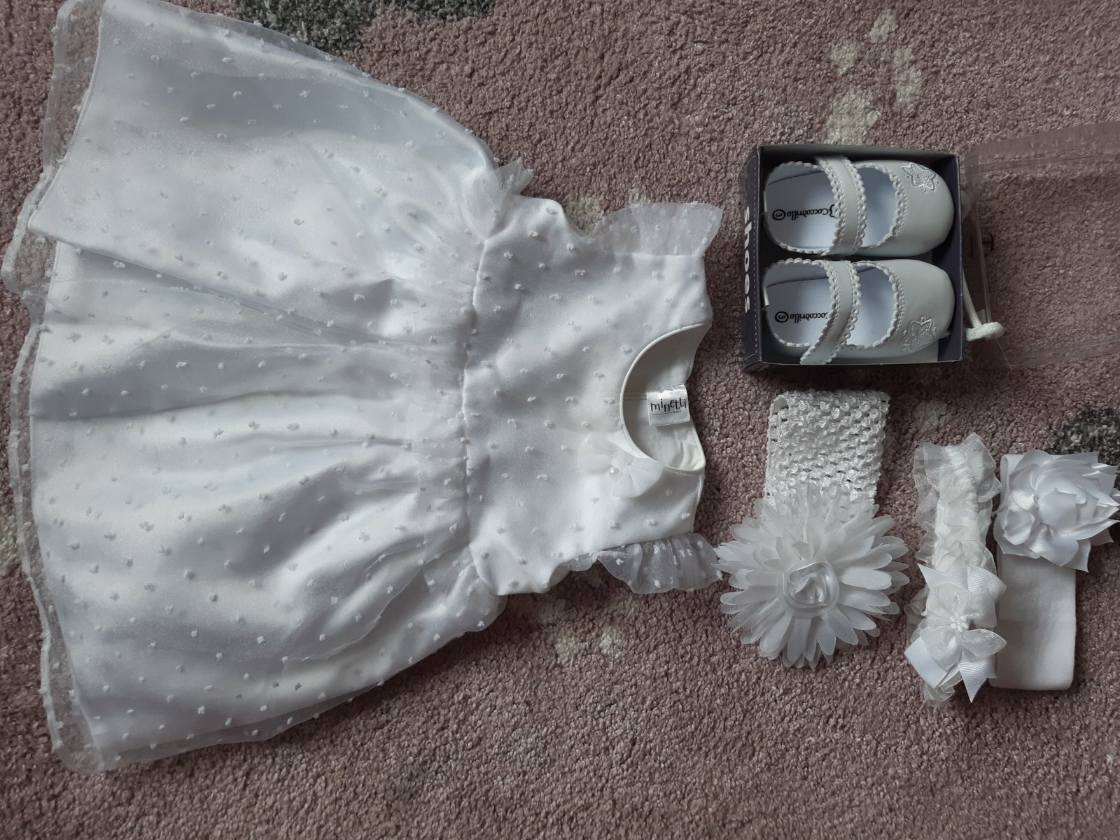Detské šaty, oblečené na krstinách, veľkosť píše 68, ale kľudne aj 74. Dĺžka cca 39cm, pás 24cmx2. Značka je Minetti. V prípade záujmu mám k nim topánočky a čelenky (cena dohodou). Vhodné na krst alebo svadbu.