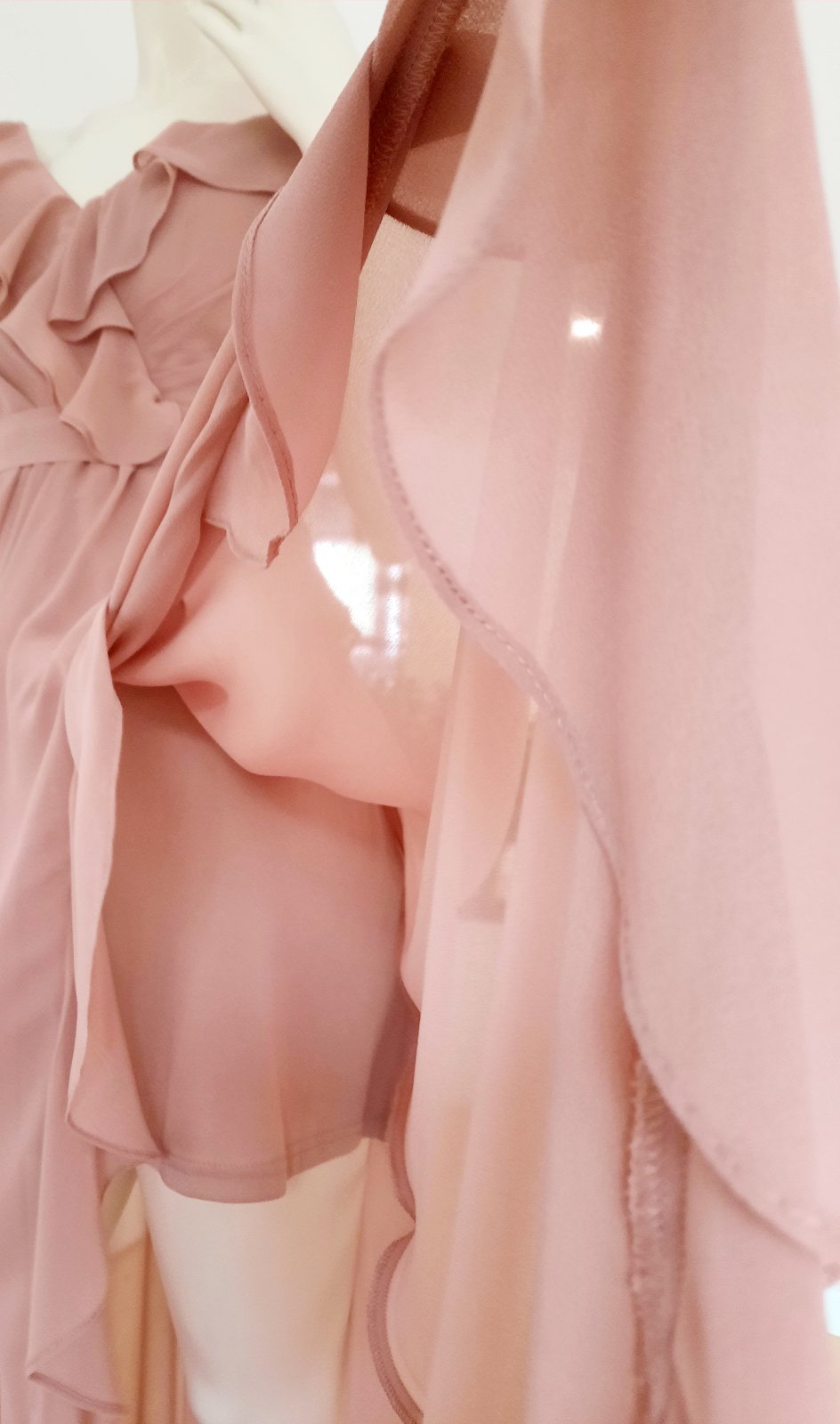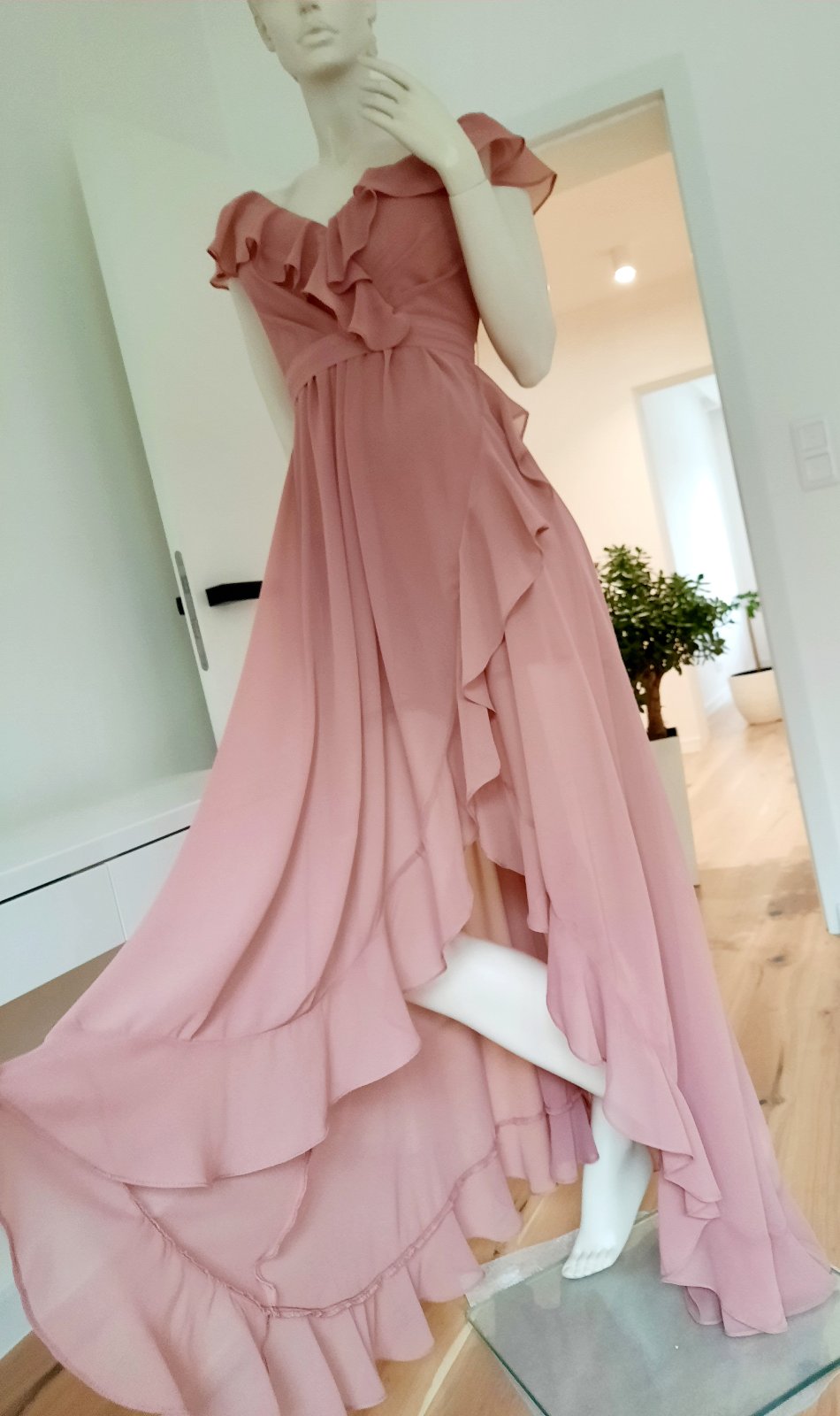 nadherne rozviate prilezitostne saty staroruzovej farby, v prsnej casti su vystuze/ vypchavky, co dotvaruje, prsia bez podprsenky, vzadu zips