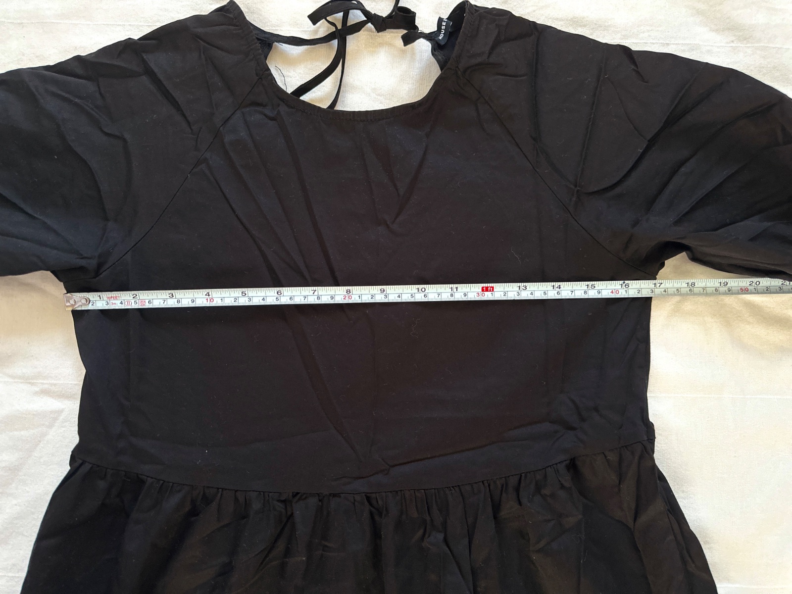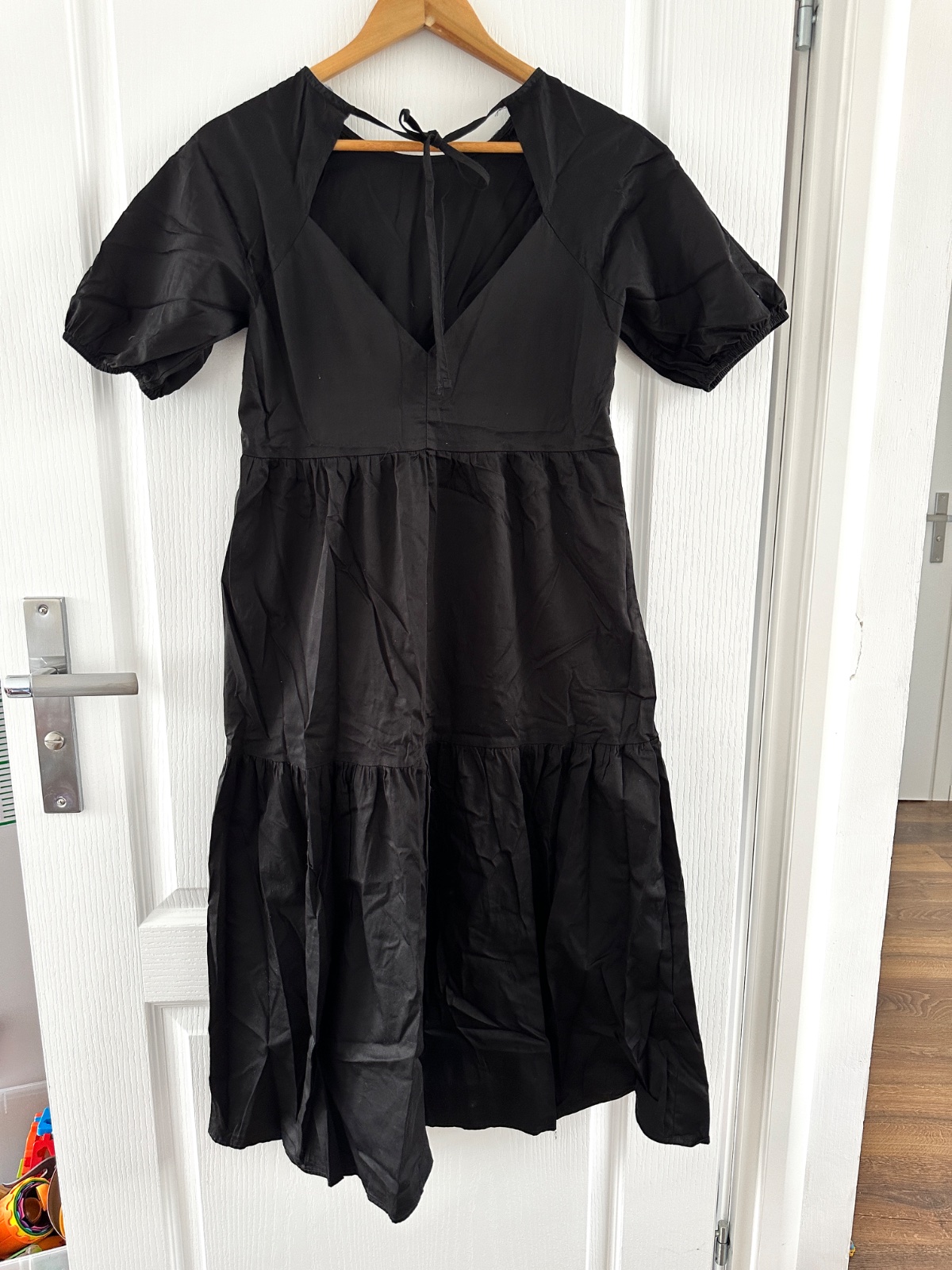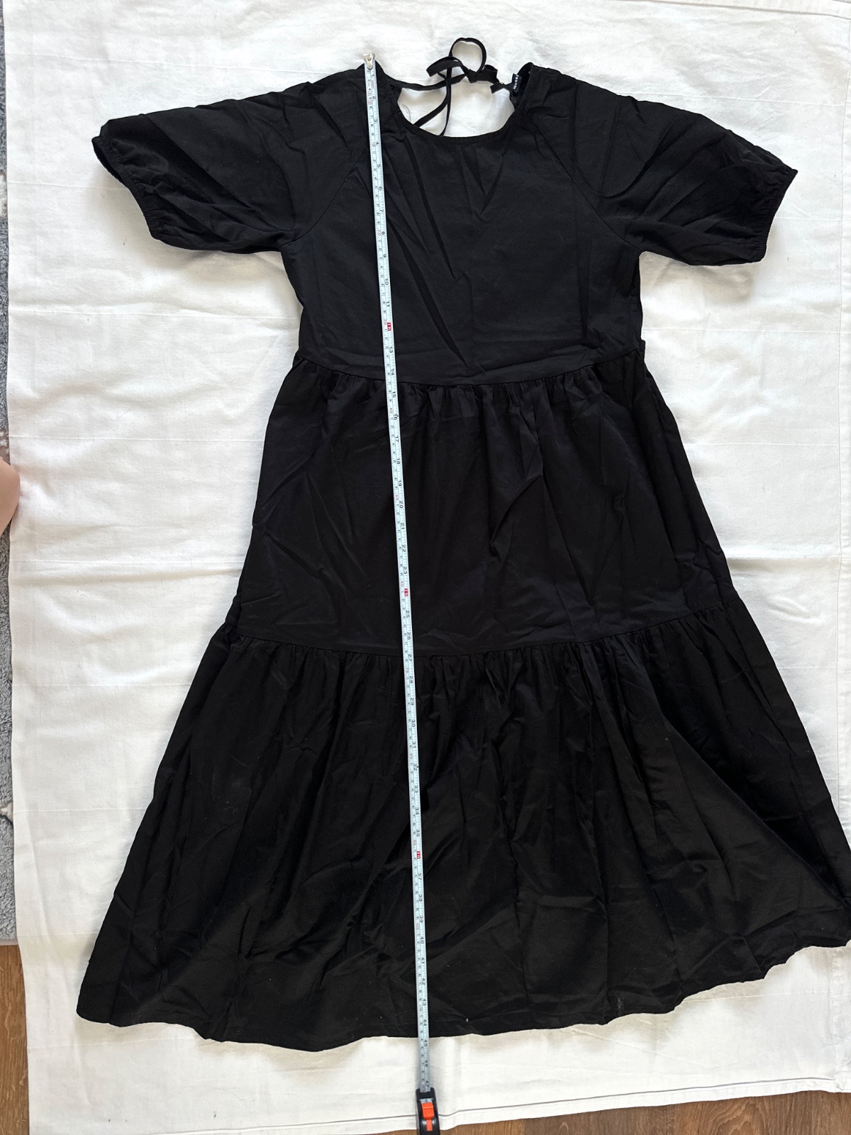 Bavlnené šaty so zaujímavým chrbtom v čiernej farbe. Šaty majú krátke rukávy s gumičkou. Majú veľmi zaujímavý chrbát s výstrihom a zaväzovaním pri krku. Napriek výstrihu nie je podprsenka pri nosení viditeľná. Predný diel je rovný. Šaty sa od pása rozširujú. Materiál je 100 % bavlna. Môžu sa nosiť ležérne aj elegantne. Veľkosť na štítku je S, všetky miery sú na fotografiách.