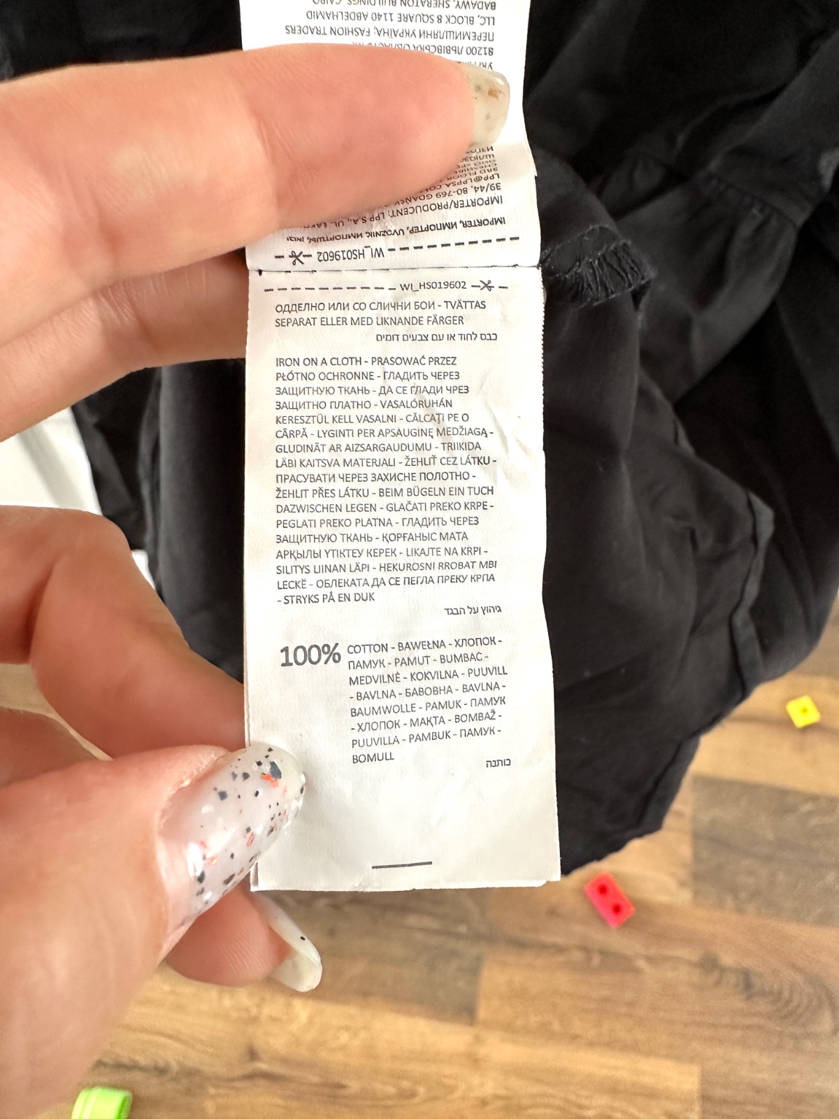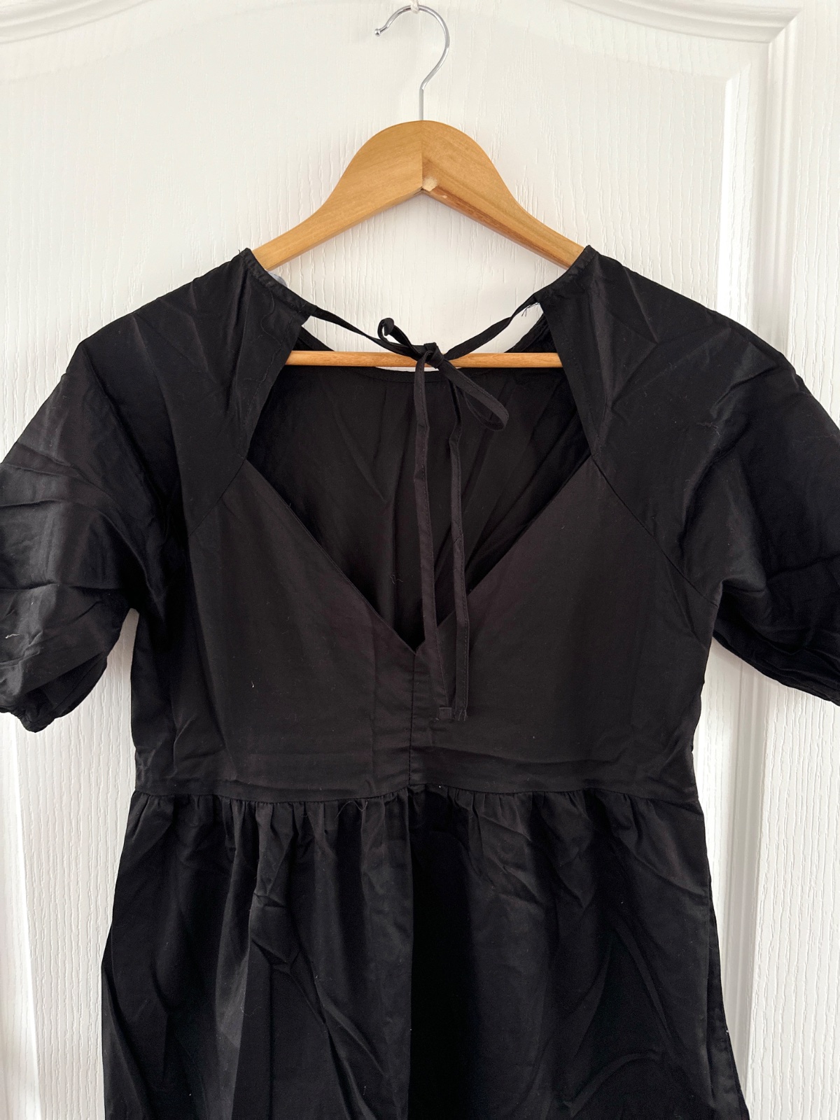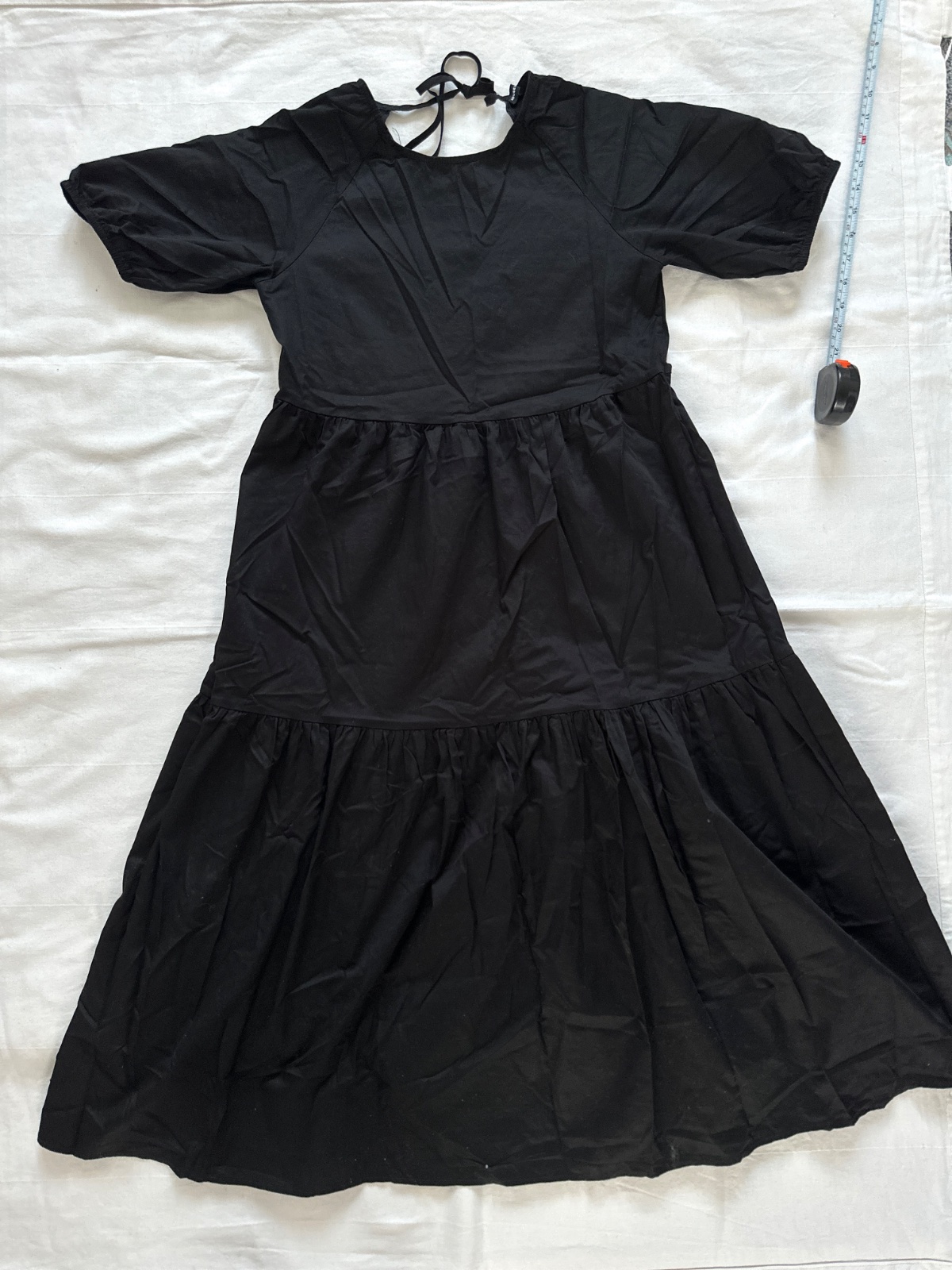 Bavlnené šaty so zaujímavým chrbtom v čiernej farbe. Šaty majú krátke rukávy s gumičkou. Majú veľmi zaujímavý chrbát s výstrihom a zaväzovaním pri krku. Napriek výstrihu nie je podprsenka pri nosení viditeľná. Predný diel je rovný. Šaty sa od pása rozširujú. Materiál je 100 % bavlna. Môžu sa nosiť ležérne aj elegantne. Veľkosť na štítku je S, všetky miery sú na fotografiách.