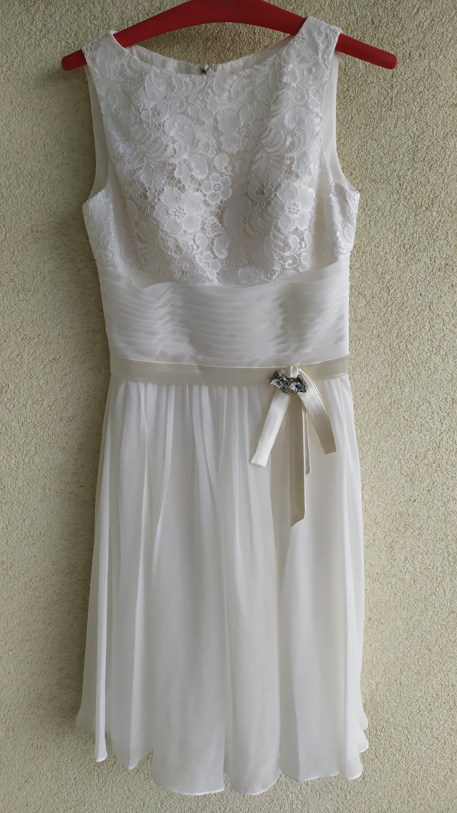 veľmi dobrý stav, bez poškodenia, raz oblečené, CD 101, dĺžka sukne 61, šírka v páse 34, šírka popod pazuchy 43, brošňa sa dá odopnúť