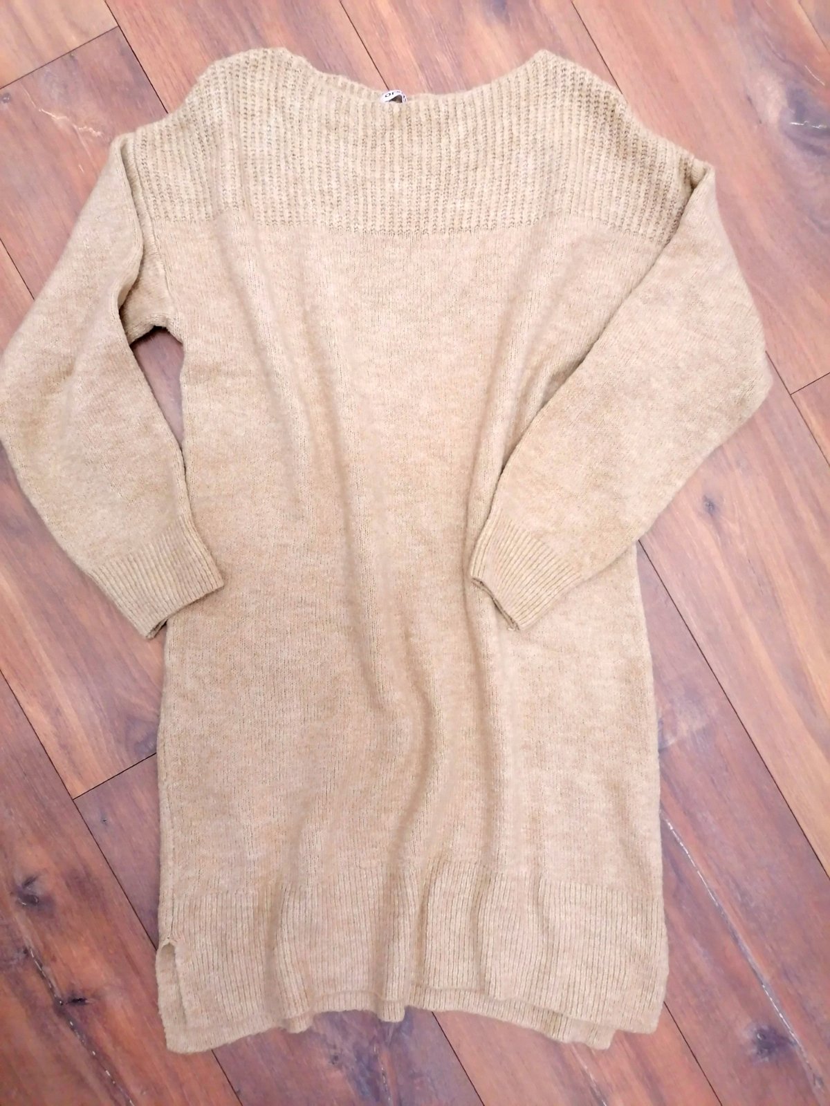 Mnou 1x oblečené svetrové šaty, bledohneda/béžová farba, bez poskodeni. Pekne vyzerajú s nejakým opaskom. Štítok s veľkosťou je odstrihnuty, ale sedia na M/L. Dĺžka 86-88 cm, šírka v prsiach 49 cm.