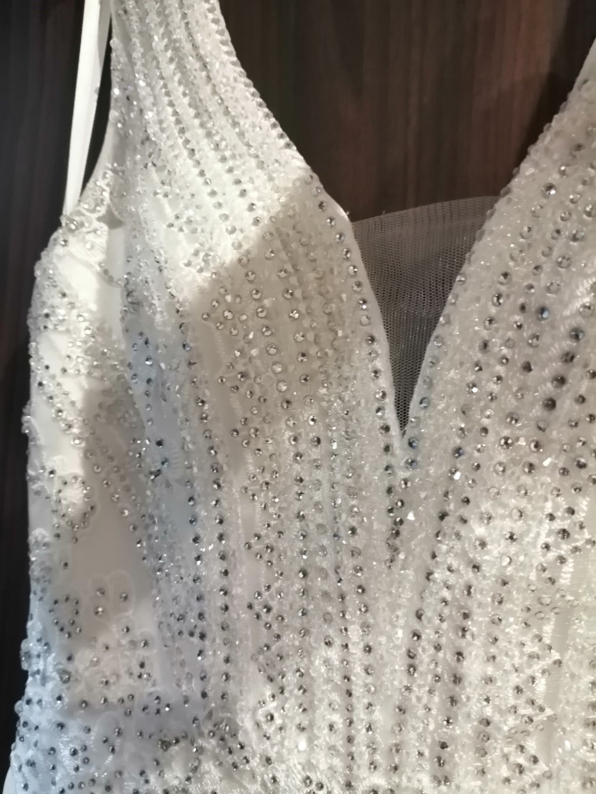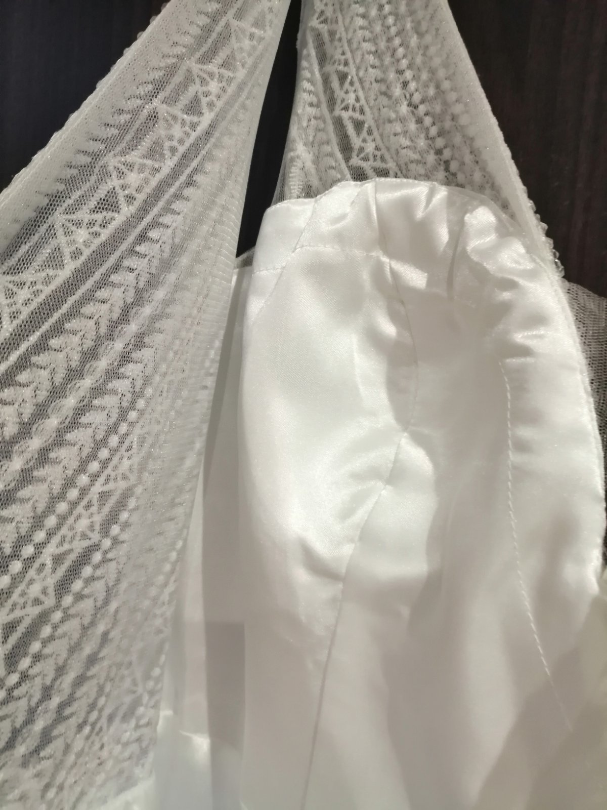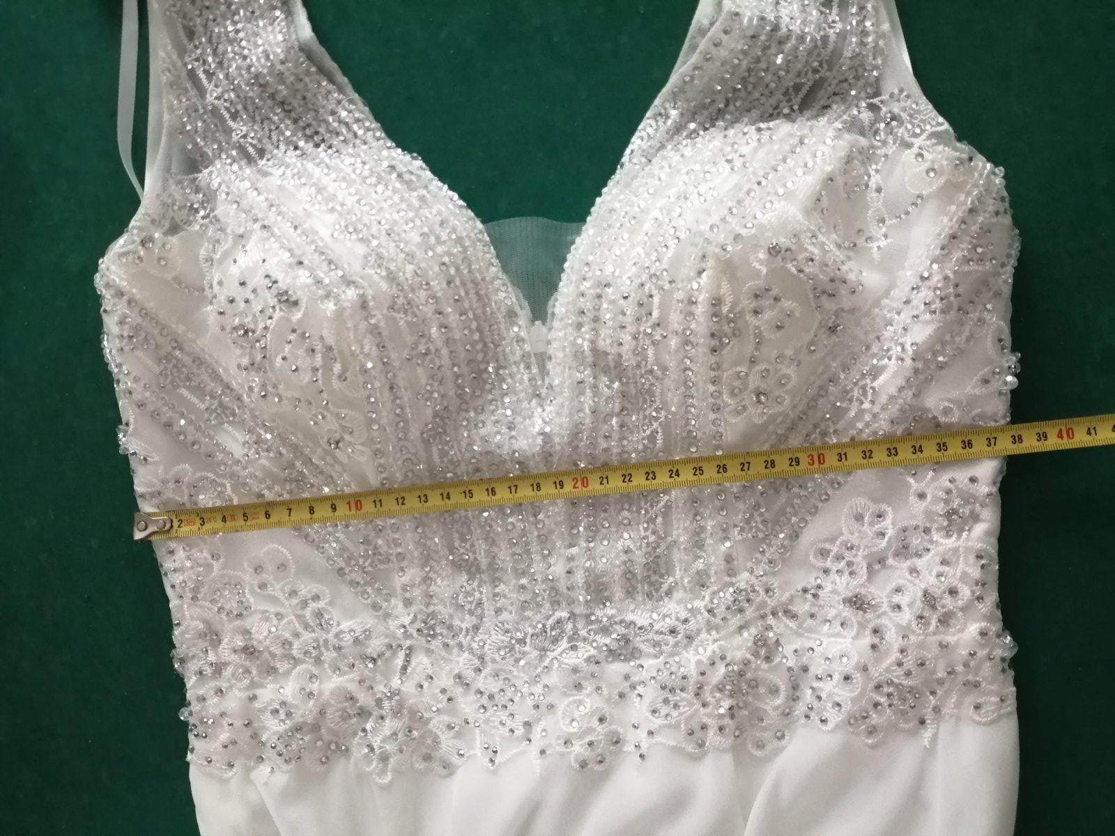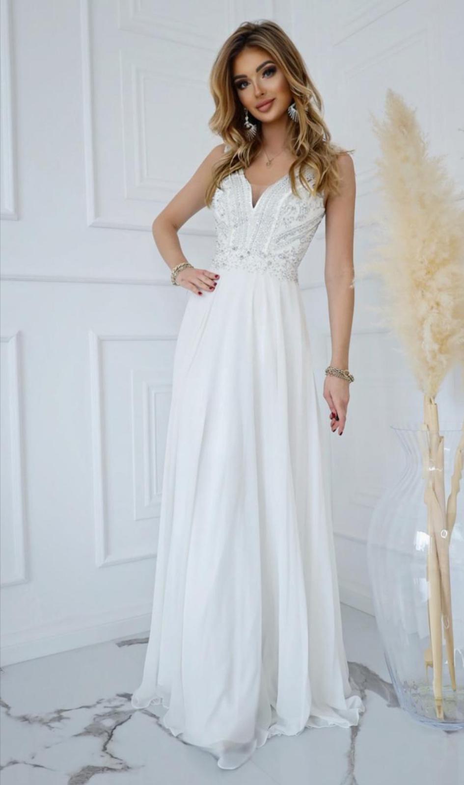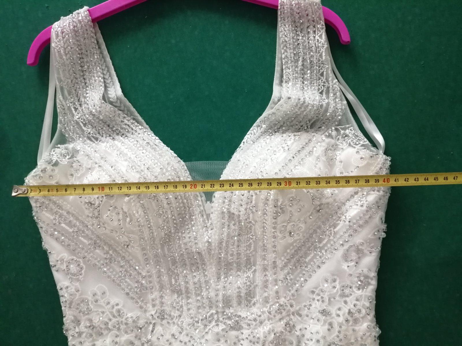 Svadobné, popolnocne alebo spoločenské viele padave šaty, raz použité ako svadobné, vyčistene, upravované na výšku 165 plus cca 7cm opätky, s hlbsim výstrihom, vystužené, na zips ale mierne elastické, sedia na veľkosť M. Kupované v salóne a upravované krajcirkou, som prvá majiteľka. K cene si treba prirátať poštovné, kludne môžete prísť vyskusat