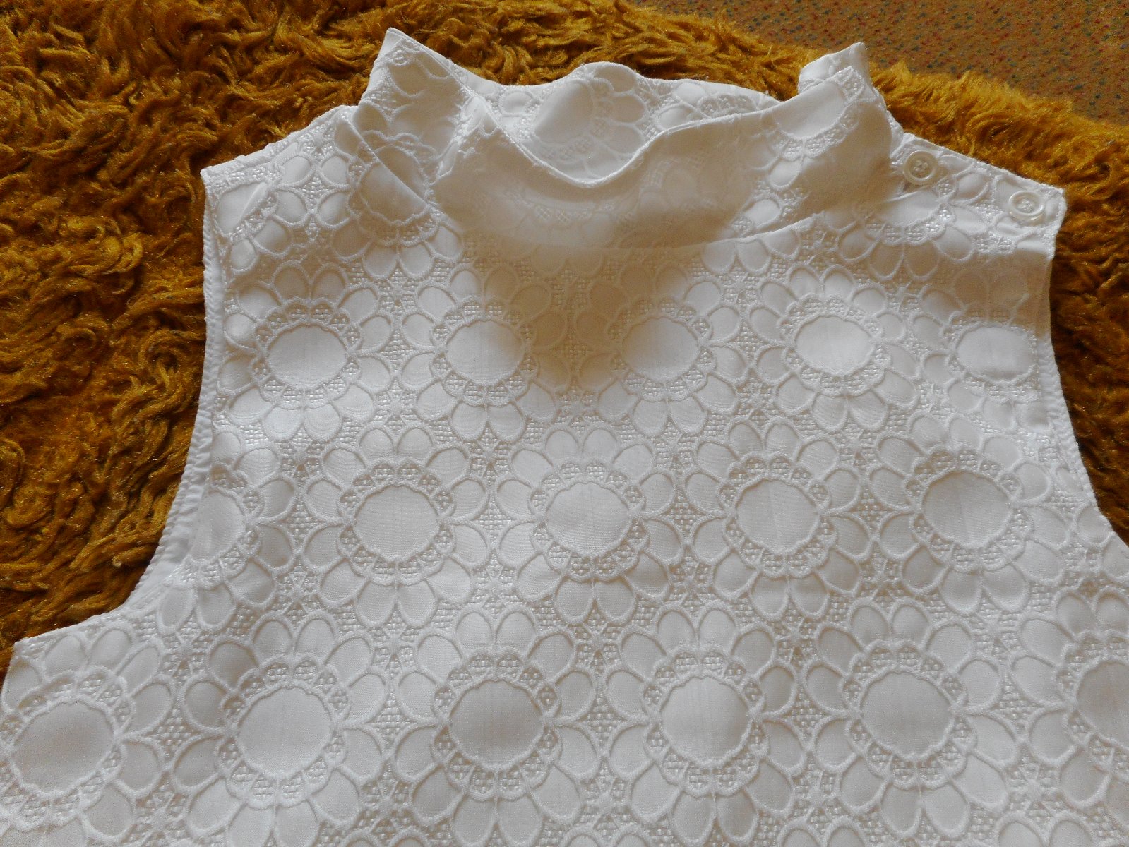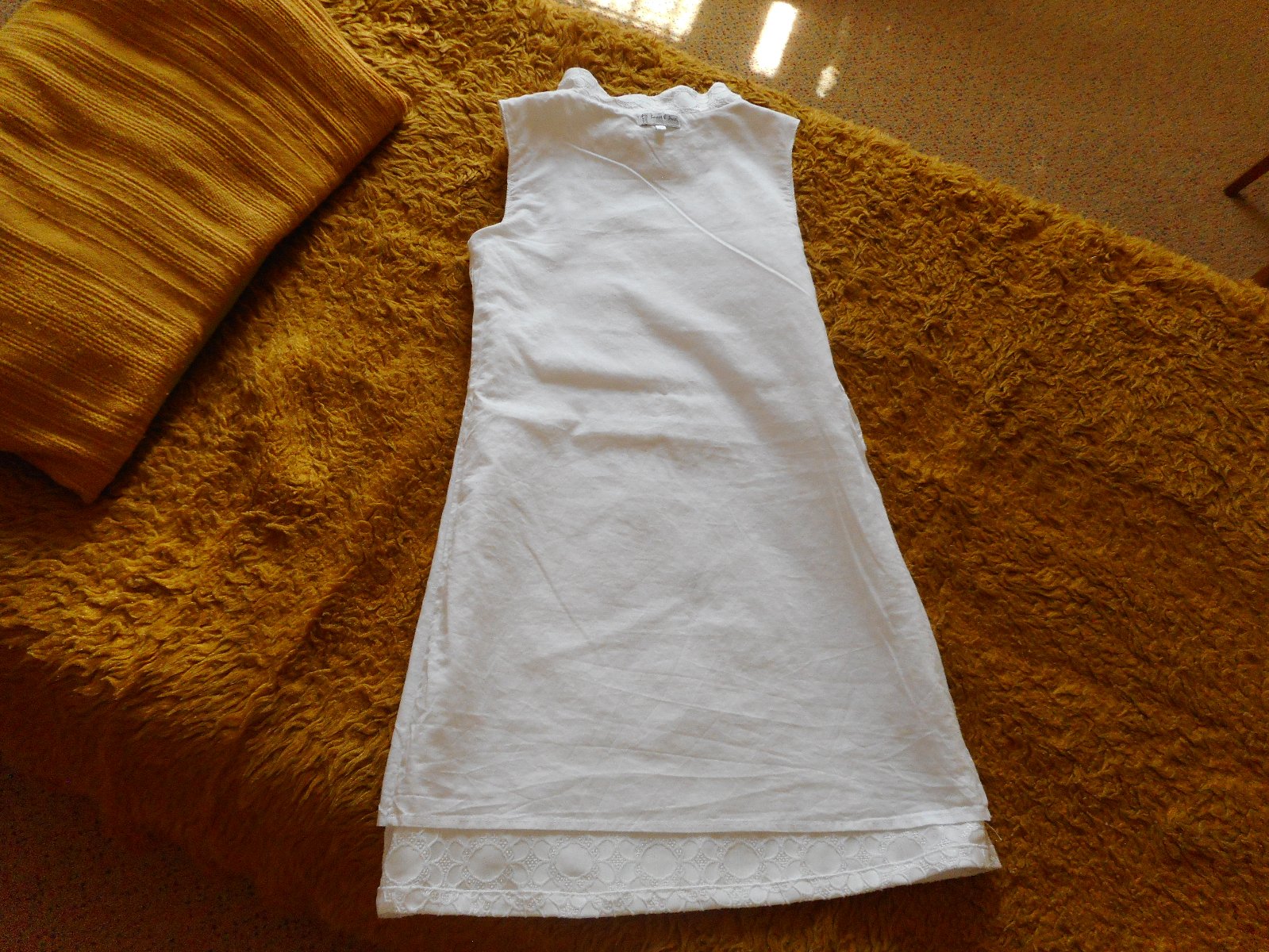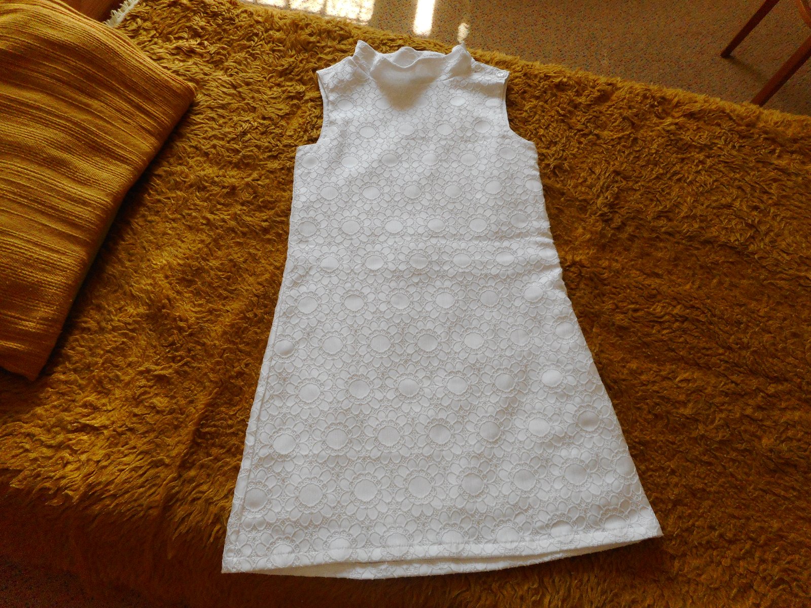 predám používané nepoškodené pekné elegantné biele šaty rovného strihu len s miernym rozšírením v štýle Jackie Kennedyová v spodnej časti bez rukávov s maličkým stojačikovým golierikom pre mladú slečnu veľkosť 152cm, s výšivkami akoby kvetov, zapínanie na boku na krytý umelý zips, nepoškodený, šírka pod pazuchami je 38cm, celková dĺžka šiat je 80cm, látka pevná, aby dobre držala tvar
